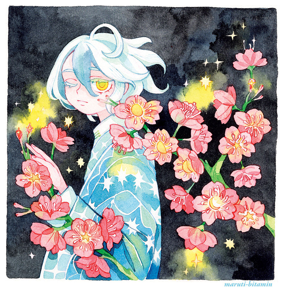 1boy ahoge androgynous artist_name bishounen black_background blue_hair blue_kimono blue_shirt border cherry_blossoms closed_mouth colored_eyelashes commentary_request crescent_moon flower glowing hair_between_eyes japanese_clothes kimono light_blue_hair long_sleeves looking_at_viewer male_focus maruti_bitamin moon moon_phases multicolored_hair night one_eye_closed original painting_(medium) pink_flower print_kimono shirt short_hair sky solo sparkle star_(sky) star_(symbol) star_print streaked_hair traditional_media upper_body watercolor_(medium) white_border white_eyelashes white_hair yellow_eyes yellow_light