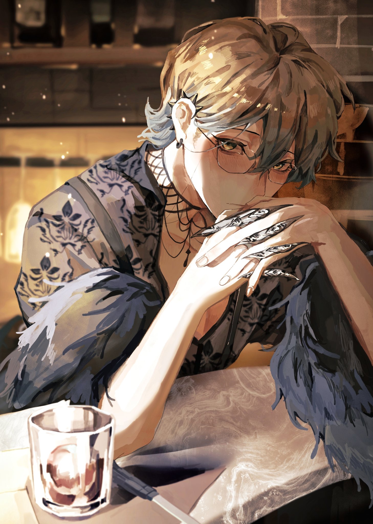 1boy bar_(place) black_choker black_shawl blue_hair brick_wall brown_hair choker claw_ring closed_mouth cup drink drinking_glass ear_piercing earrings elbows_on_table fingernails fur_shawl glasses gradient_hair hair_between_eyes hashtag-only_commentary highres hoop_earrings ice ice_cube ike_eveland indoors interlocked_fingers jewelry lace_shirt light_blush looking_at_viewer male_focus multicolored_hair nijisanji nijisanji_en pectoral_cleavage pectorals piercing shawl shot_glass solo suspenders tanze0814 upper_body virtual_youtuber yellow_eyes