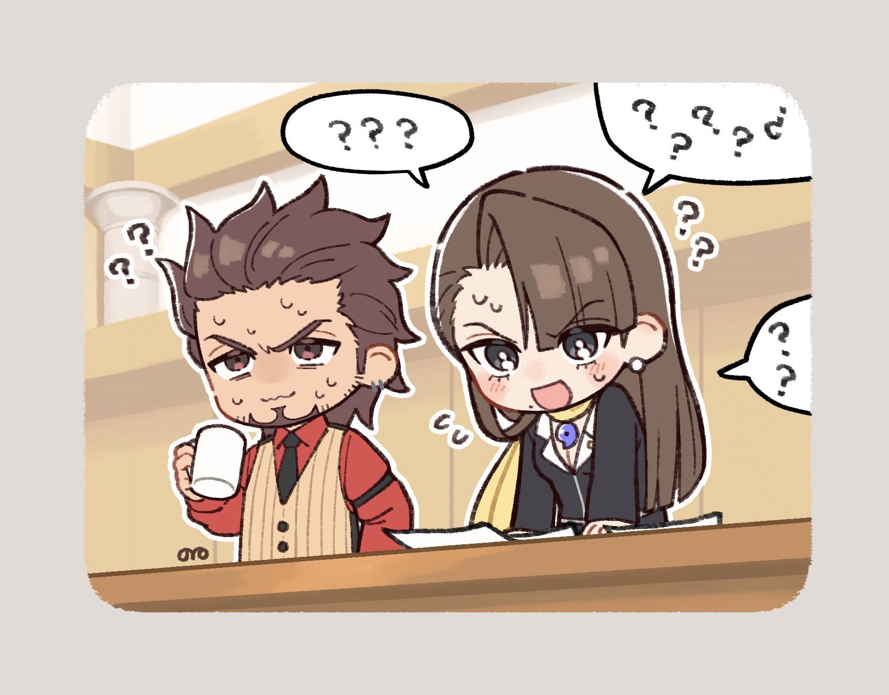 1boy 1girl ? ace_attorney arm_strap black_jacket black_necktie blush bn_noru border brown_eyes brown_hair brown_vest chibi coffee_mug commentary_request courtroom cup desk diego_armando earrings facial_hair flying_sweatdrops grey_border grey_eyes hand_up highres holding holding_cup jacket jewelry lapel_pin long_hair magatama mia_fey mug necktie outline paper phoenix_wright:_ace_attorney_-_trials_and_tribulations red_shirt scarf shirt short_hair signature speech_bubble spoken_question_mark sweat vest white_outline yellow_scarf