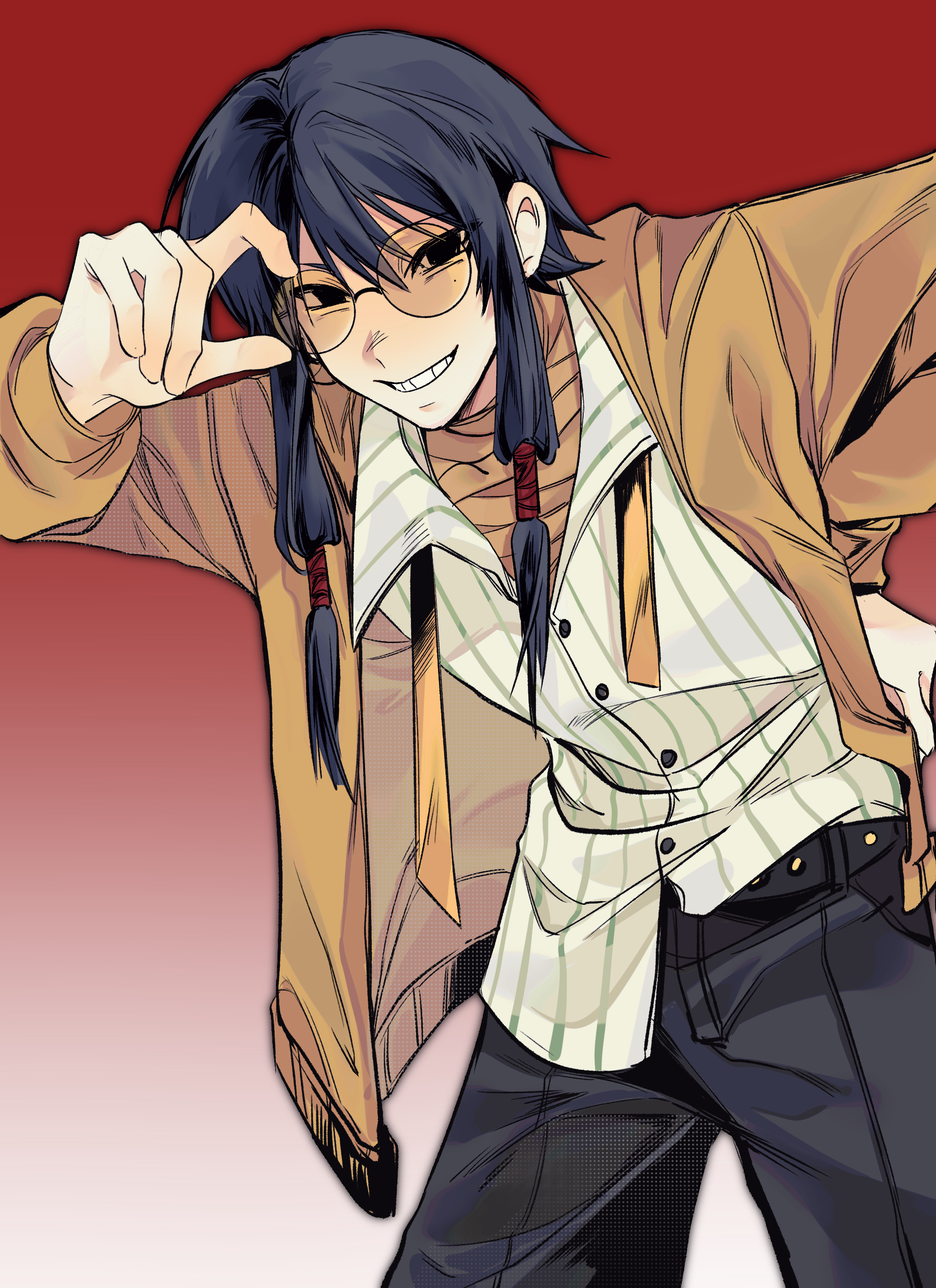 1boy absurdres adjusting_eyewear black_eyes black_hair black_pants chinese_commentary collared_shirt commentary_request cowboy_shot gradient_background grin hand_on_own_hip highres jacket long_sleeves male_focus mole mole_under_eye open_clothes open_jacket pants red_background round_eyewear shirt shirt_partially_tucked_in short_hair_with_long_locks smile solo striped_clothes striped_shirt touqi_guaitan vertical-striped_clothes vertical-striped_shirt white_shirt yellow_jacket yu06836928 ziche_fuzhao