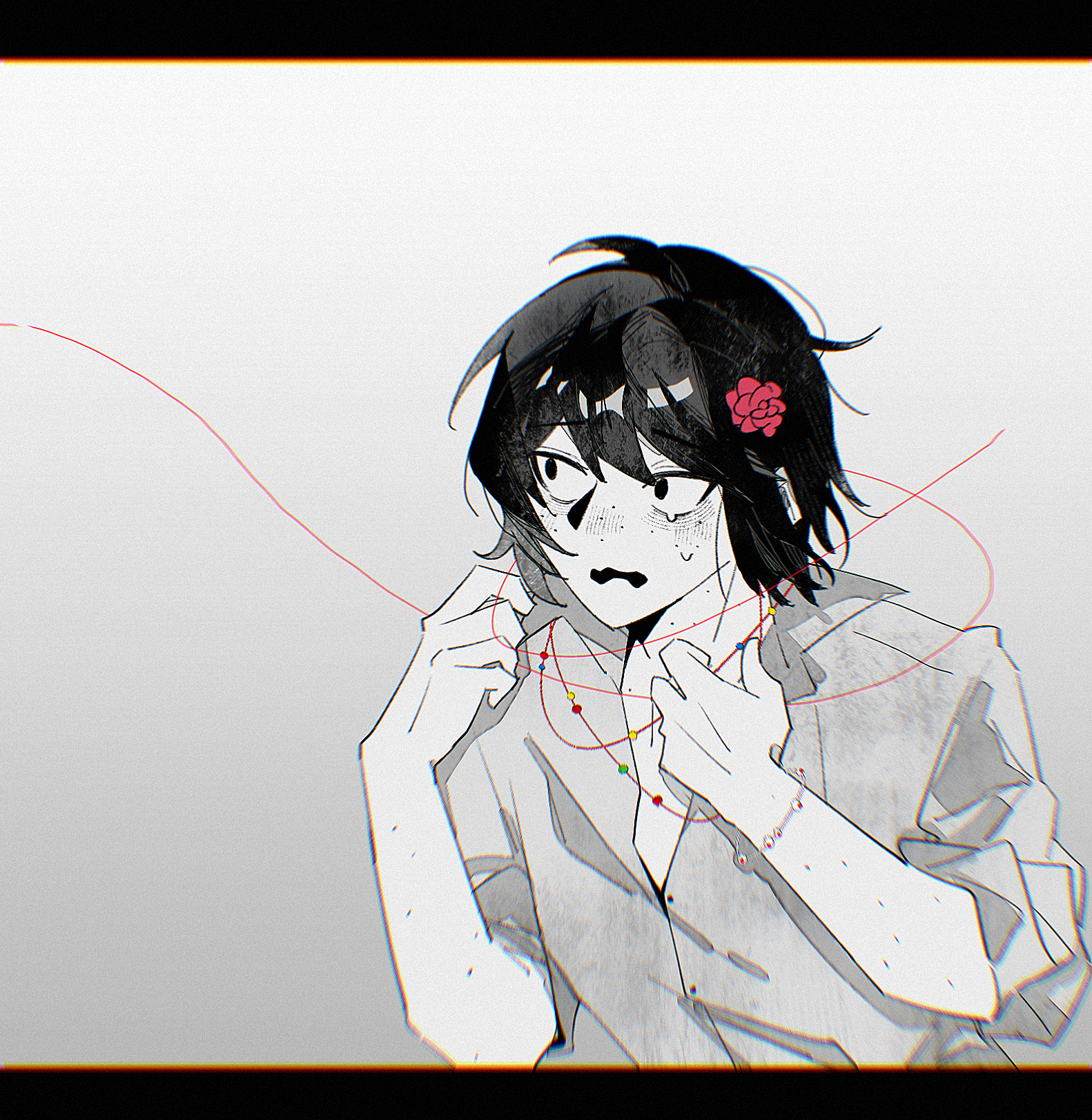 1boy apricity321 body_freckles bracelet chinese_commentary chromatic_aberration collared_shirt commentary_request constricted_pupils flower freckles fu_shun_(touqi_guaitan) grey_background greyscale hair_flower hair_ornament highres jewelry letterboxed male_focus monochrome open_mouth red_flower shirt short_hair sleeves_rolled_up solo spot_color string string_of_fate sweat teardrop touqi_guaitan upper_body
