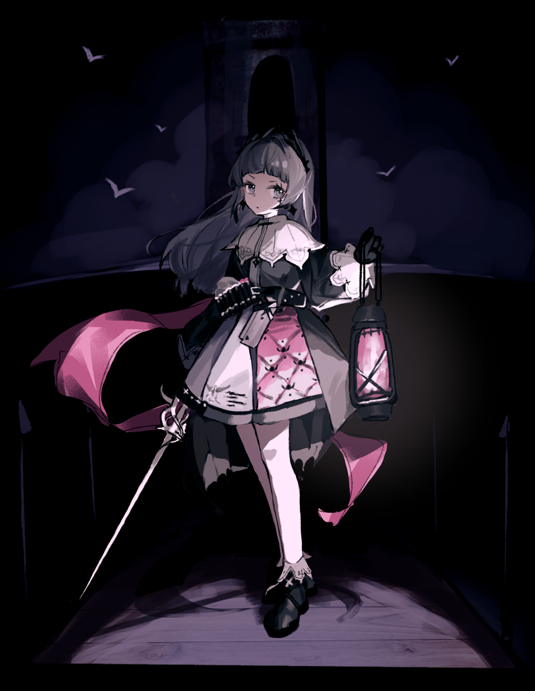 1girl arknights black_dress commentary_request dark dress floating_hair full_body grey_eyes grey_hair highres holding holding_lantern holding_sword holding_weapon humi-f irene_(arknights) lantern long_hair long_sleeves looking_at_viewer simple_bird solo standing sword weapon white_dress