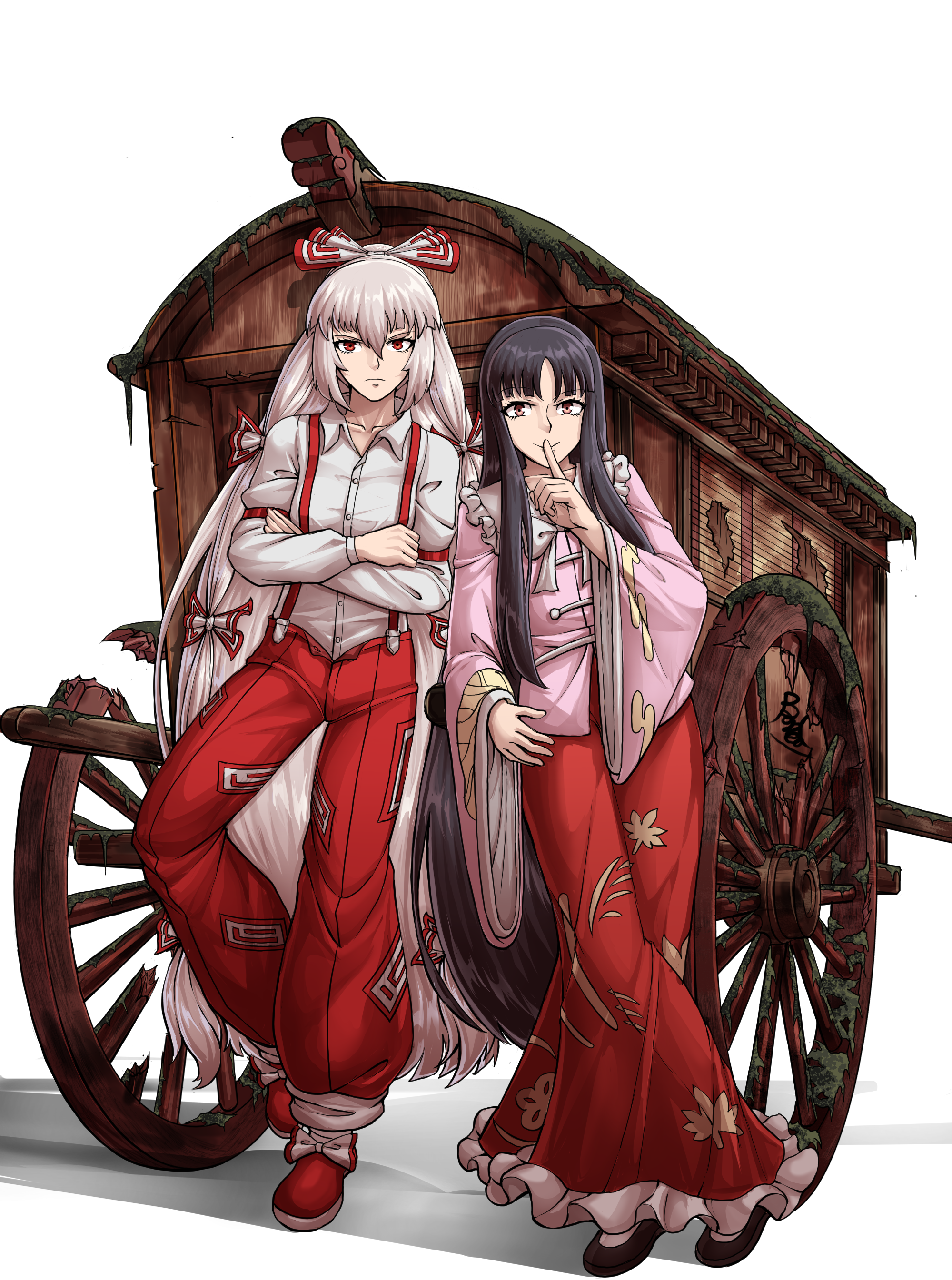 2girls absurdres black_hair bow buhbuhbored carriage fujiwara_no_mokou grey_hair greyscale hair_bow hair_ribbon hat highres houraisan_kaguya long_hair long_sleeves monochrome multiple_girls open_mouth pants red_eyes ribbon shirt skirt smile suspenders touhou very_long_hair white_hair wide_sleeves