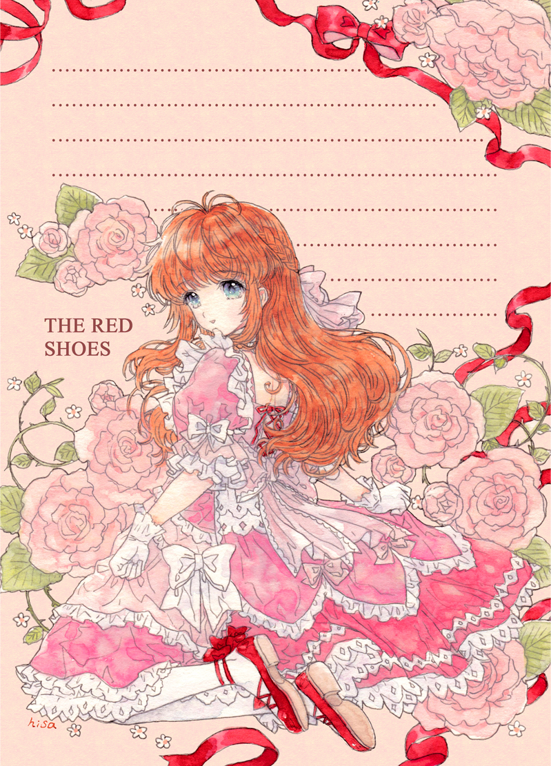 1girl 2020s 2024 blue_eyes dress english_text female_focus flower hisakata_(hisa_nn) kneeling long_hair looking_at_viewer orange_hair pink_dress pink_flower pink_rose red_ribbon red_shoes ribbon rose shoes white_flower