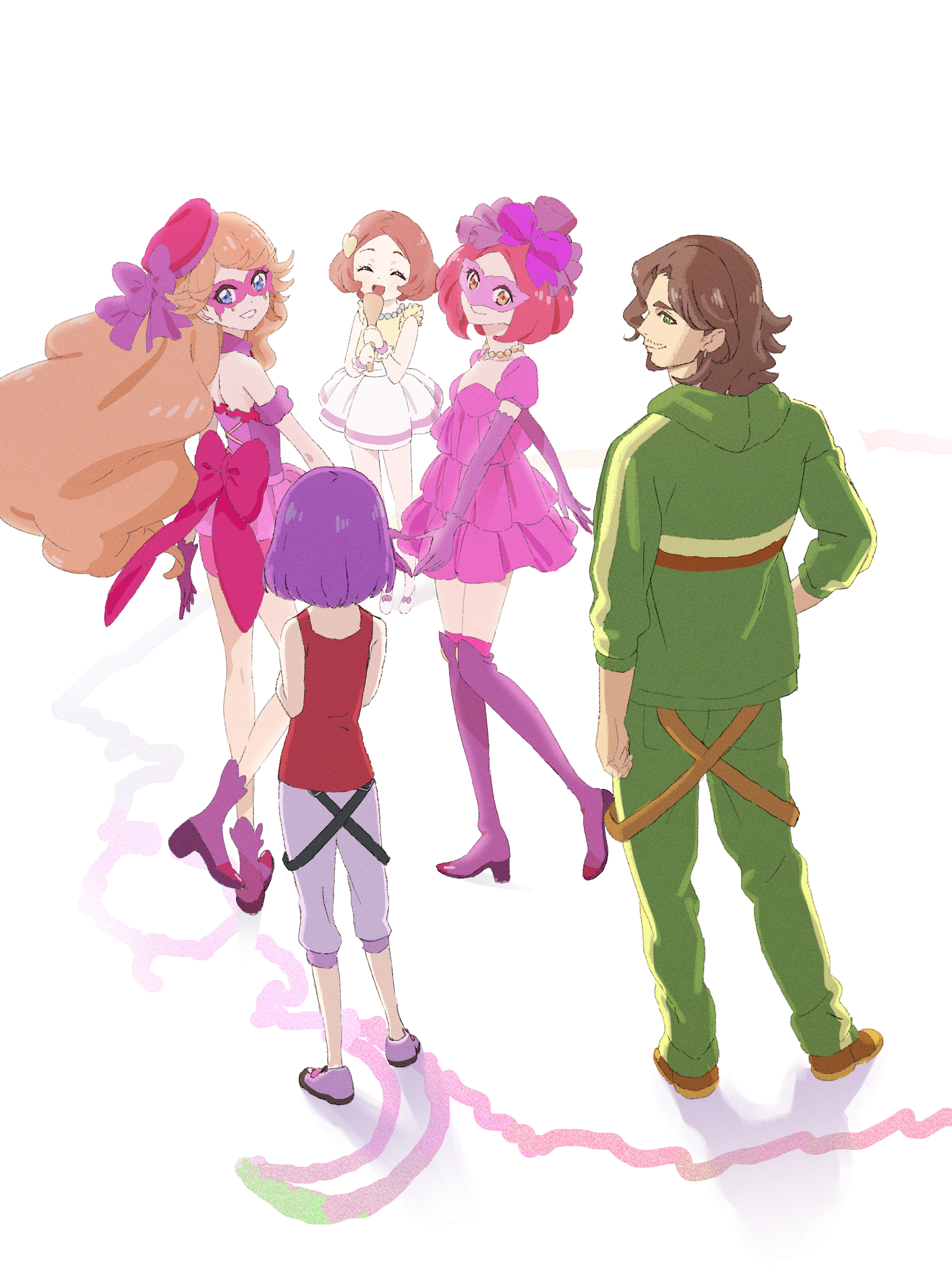 1boy 4girls :d aikatsu! aikatsu!_(series) arm_at_side bare_shoulders beard blue_eyes bow brown_hair closed_eyes dot_nose dress dual_persona elbow_gloves facial_hair forehead fox_mask from_behind gloves green_eyes green_hoodie green_pants grin hair_ornament hat hat_bow heart heart_hair_ornament high_heels highres holding hood hood_down hoodie hoshimiya_ringo_(aikatsu!) idol jewelry johnny_beppu kanzaki_mizuki long_hair long_sleeves looking_at_viewer mask masquerade_mask medium_hair mitsuishi_orihime multiple_girls necklace open_mouth pants pearl_necklace pink_dress pink_hat pink_sash purple_bow purple_footwear purple_gloves purple_hair purple_shorts purple_thighhighs red_hair red_shirt saitou_atsushi_(kamatamanankotu) sash shirt shoes short_dress shorts simple_background skirt sleeveless sleeveless_shirt smile standing thighhighs white_background white_skirt yellow_eyes yellow_shirt zettai_ryouiki