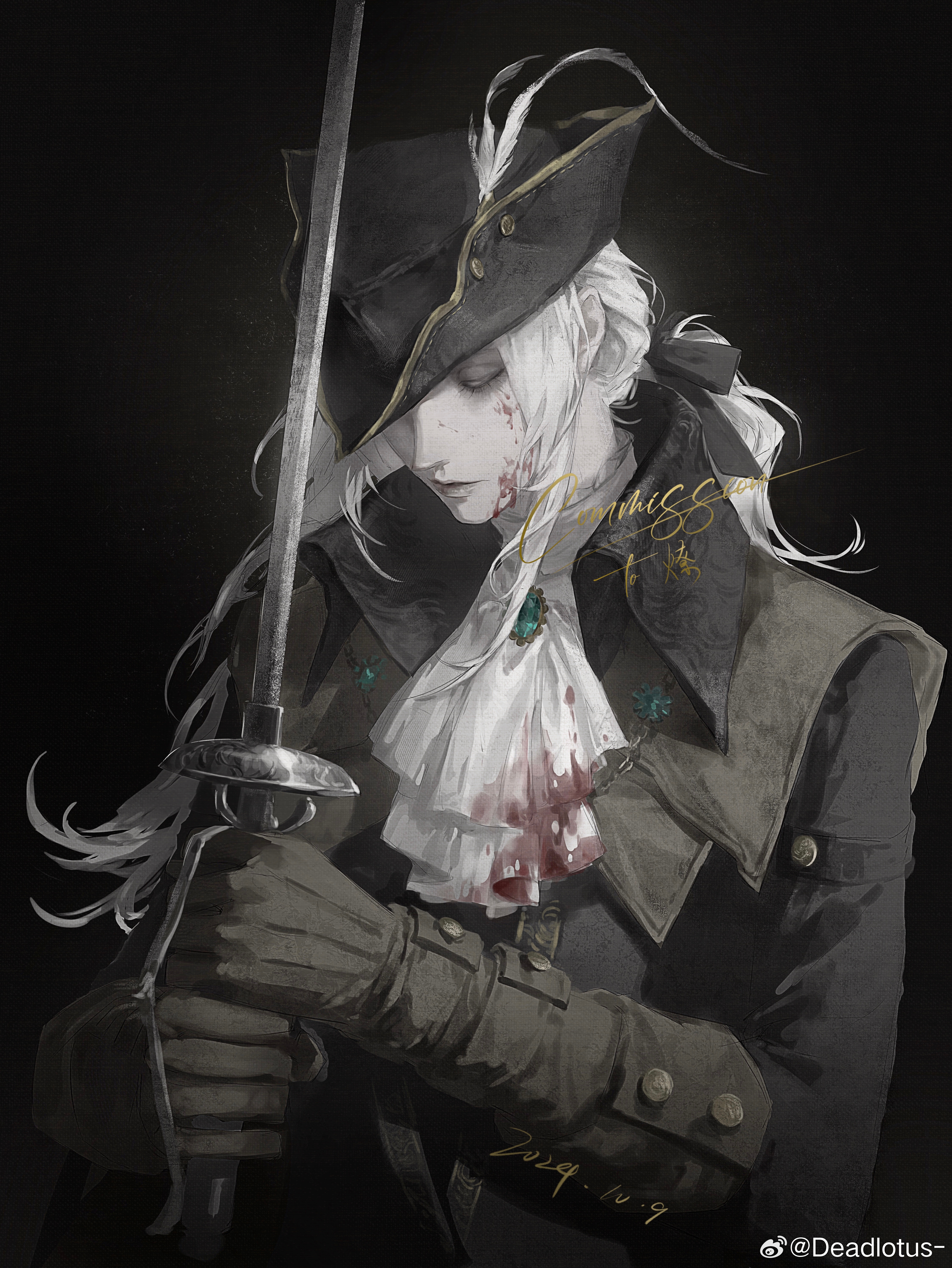1girl absurdres ascot black_background black_gloves black_jacket blood blood_on_clothes blood_on_face blood_stain bloodborne closed_eyes closed_mouth dated double_blade gem gloves hat hat_feather highres holding holding_sword holding_weapon jacket jiao_chang lady_maria_of_the_astral_clocktower long_hair low-tied_long_hair pale_skin rakuyo_(bloodborne) signature solo sword tricorne weapon white_ascot white_hair