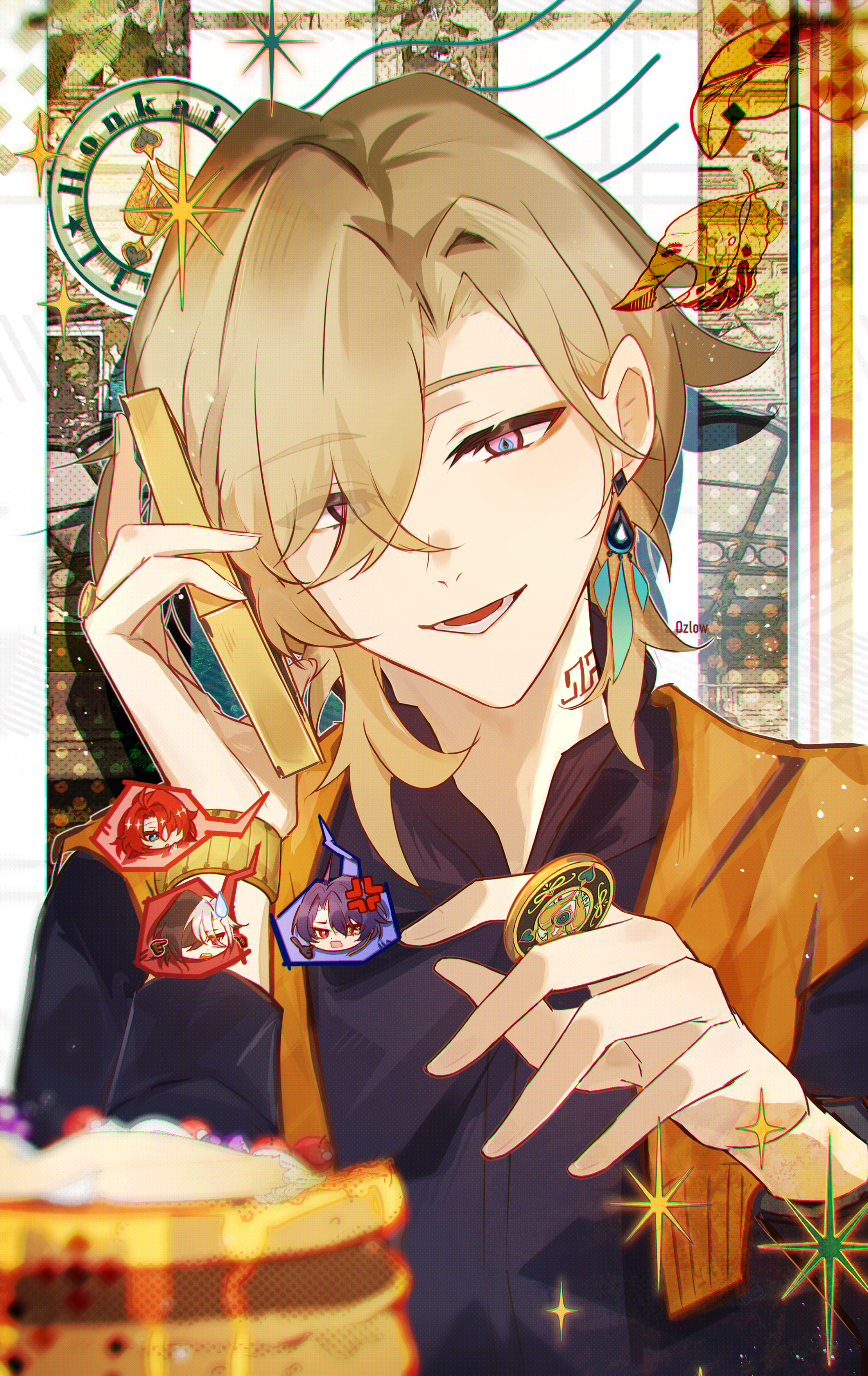1boy absurdres aventurine_(honkai:_star_rail) black_shirt blonde_hair blue_eyes boothill_(honkai:_star_rail) calling cellphone coin commentary dr._ratio_(honkai:_star_rail) earrings english_commentary eyes_visible_through_hair food hair_over_one_eye highres holding holding_coin holding_phone honkai:_star_rail honkai_(series) jewelry looking_down male_focus medium_hair multicolored_eyes ozuro_(orzbone2008) pancake pancake_stack phone pink_eyes shirt smartphone solo two-tone_eyes upper_body