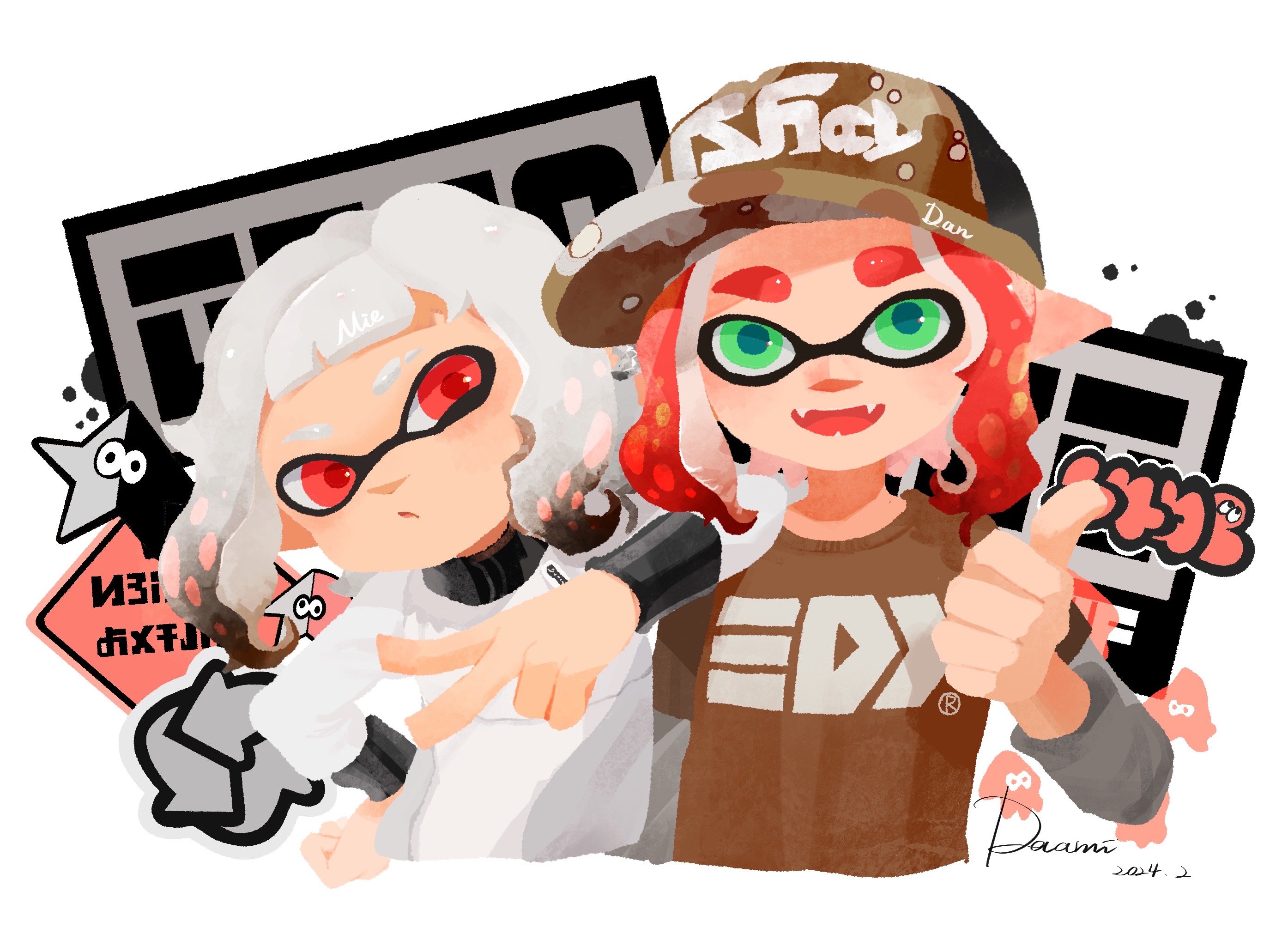1boy 1girl arm_at_side arm_on_another's_shoulder baseball_cap black_hair blunt_bangs brown_hat brown_shirt camouflage_headwear colored_tips daami_(daami2000) dated elbow_rest eyebrow_cut fangs green_eyes grey_sleeves hand_on_own_hip hand_up hat highres inkling inkling_player_character inward_v layered_sleeves long_sleeves looking_ahead looking_at_viewer looking_to_the_side multicolored_hair nintendo no_lineart official_style open_mouth patterned_background pointy_ears pout print_shirt red_eyes red_hair red_pupils shirt short_hair short_over_long_sleeves short_sleeves side-by-side sideways_glance signature splatoon_(series) splatoon_3 spotted_hair sweater thumbs_up turtleneck turtleneck_sweater uneven_eyes upper_body v wavy_hair white_background white_hair white_sweater