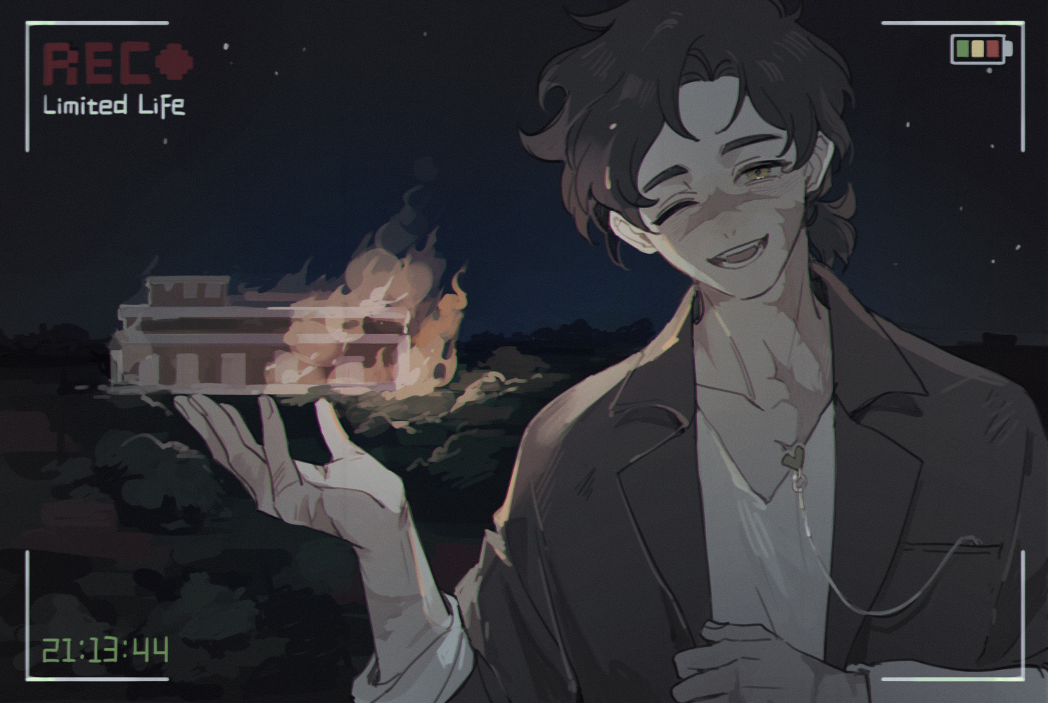 1boy animification brown_hair building burning burning_building commentary english_commentary fire goodtimeswithscar green_eyes jacket life_heart_(traffic_life) limited_life_smp looking_at_viewer luminous_slime male_focus minecraft_youtube one_eye_closed open_clothes open_jacket open_mouth outdoors ponytail scar scar_on_arm scar_on_face shirt short_hair short_ponytail smile solo traffic_life_series viewfinder white_shirt