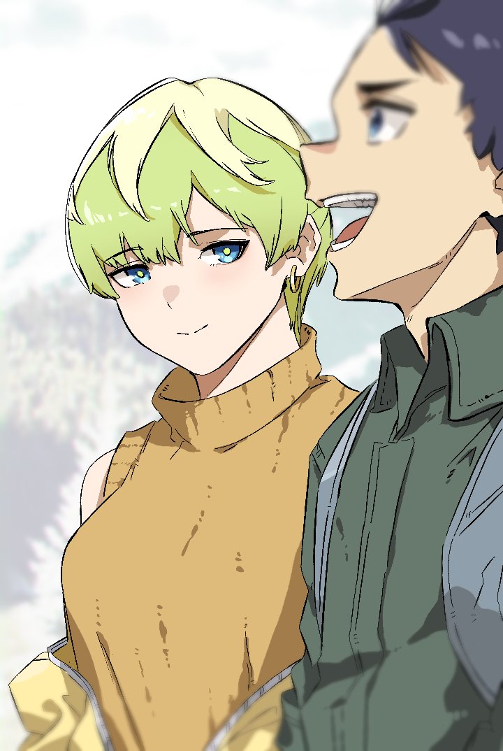 1boy 1girl black_hair blue_eyes earrings green_hair green_jacket izumo_tenka jacket jewelry mato_seihei_no_slave saikiseiya short_hair sleeveless sleeveless_turtleneck smile sweater turtleneck turtleneck_sweater wakura_yuuki