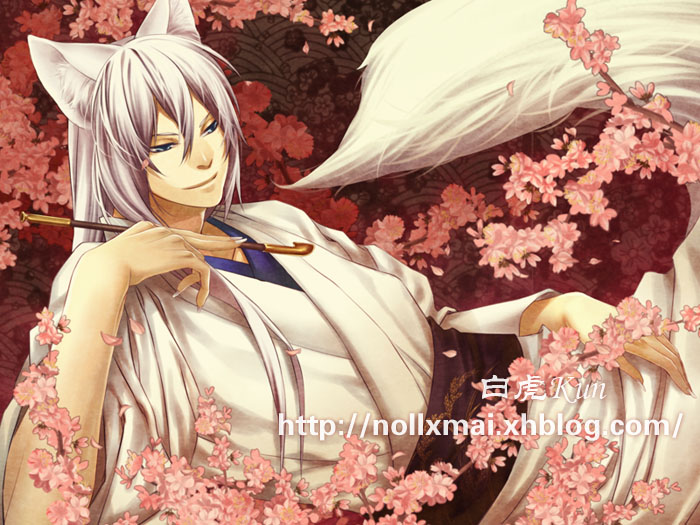 1boy animal_ears blue_eyes cherry_blossoms commentary_request fingernails fox_boy fox_ears fox_tail holding holding_smoking_pipe japanese_clothes kamisama_hajimemashita kimono kiseru long_hair lying male_focus nollxmai on_side red_background seigaiha sharp_fingernails smile smoking_pipe solo tail tomoe_(kamisama_hajimemashita) white_hair white_kimono