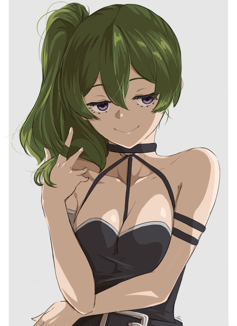 anho armband bare_shoulders belt black_choker breasts choker grey_hair hair_between_eyes hand_in_own_hair looking_down medium_breasts o-ring out_of_frame portrait purple_eyes simple_background small_breasts smile sousou_no_frieren ubel_(sousou_no_frieren) upper_body