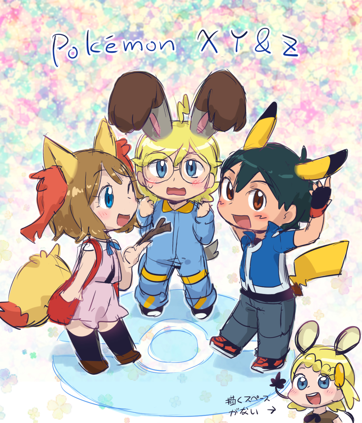 2boys 2girls animal_ears ash_ketchum black_hair blonde_hair blue_eyes blue_jumpsuit blush bonnie_(pokemon) braixen braixen_(cosplay) brown_eyes brown_hair bunnelby bunnelby_(cosplay) clemont_(pokemon) cosplay dedenne dedenne_(cosplay) facial_mark gen_1_pokemon gen_6_pokemon glasses hair_ornament hairclip highres jumpsuit multiple_boys multiple_girls nintendo pikachu pikachu_(cosplay) pokemon pokemon_(anime) pokemon_the_series:_xy serena_(pokemon) side_ponytail smile stick tail