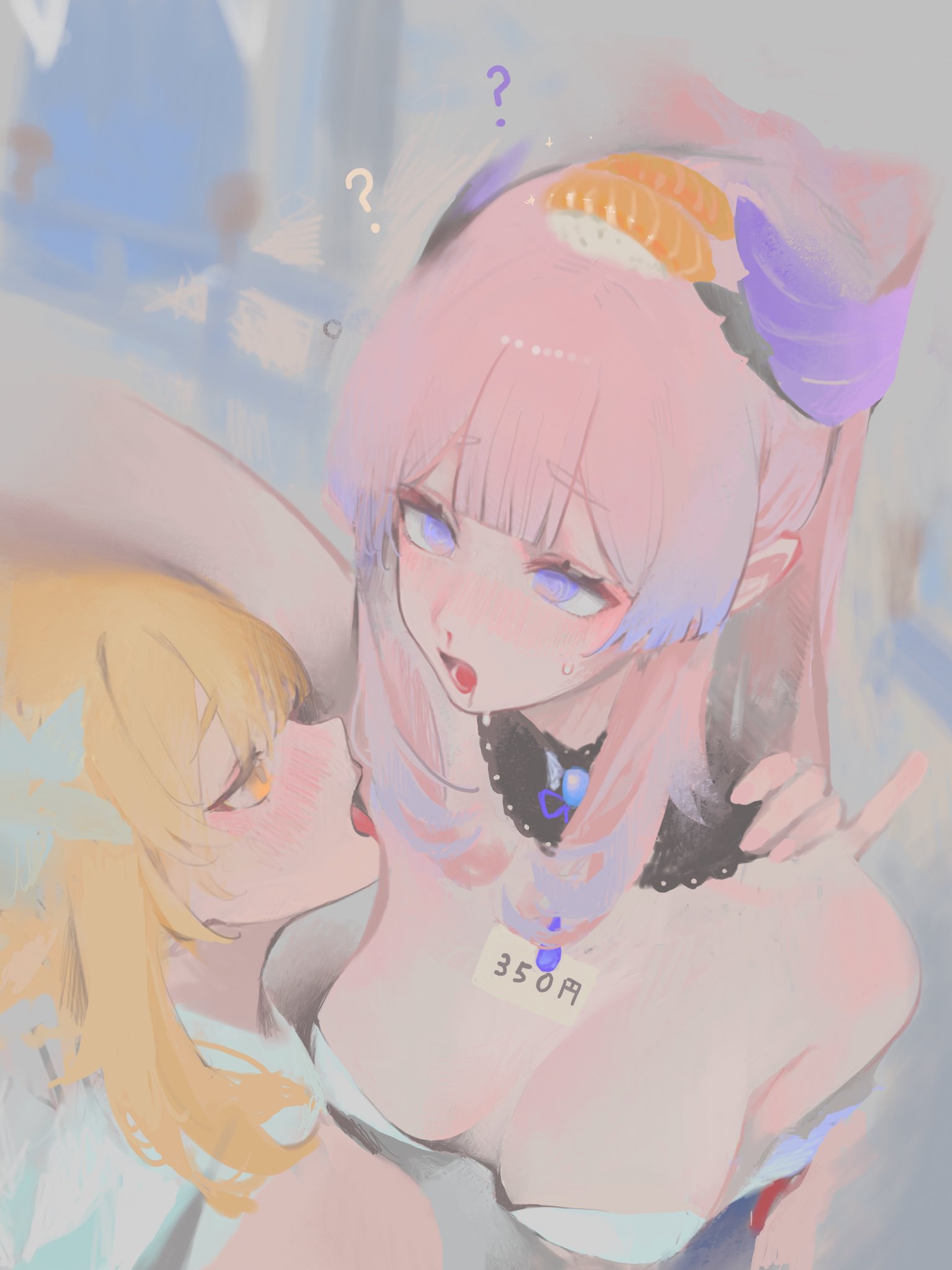 2girls ? ?? armpits blonde_hair blue_eyes commentary food genshin_impact hair_ornament highres kayakooooo licking licking_armpit long_hair lumine_(genshin_impact) multiple_girls pink_hair sangonomiya_kokomi sushi tongue yellow_eyes yuri