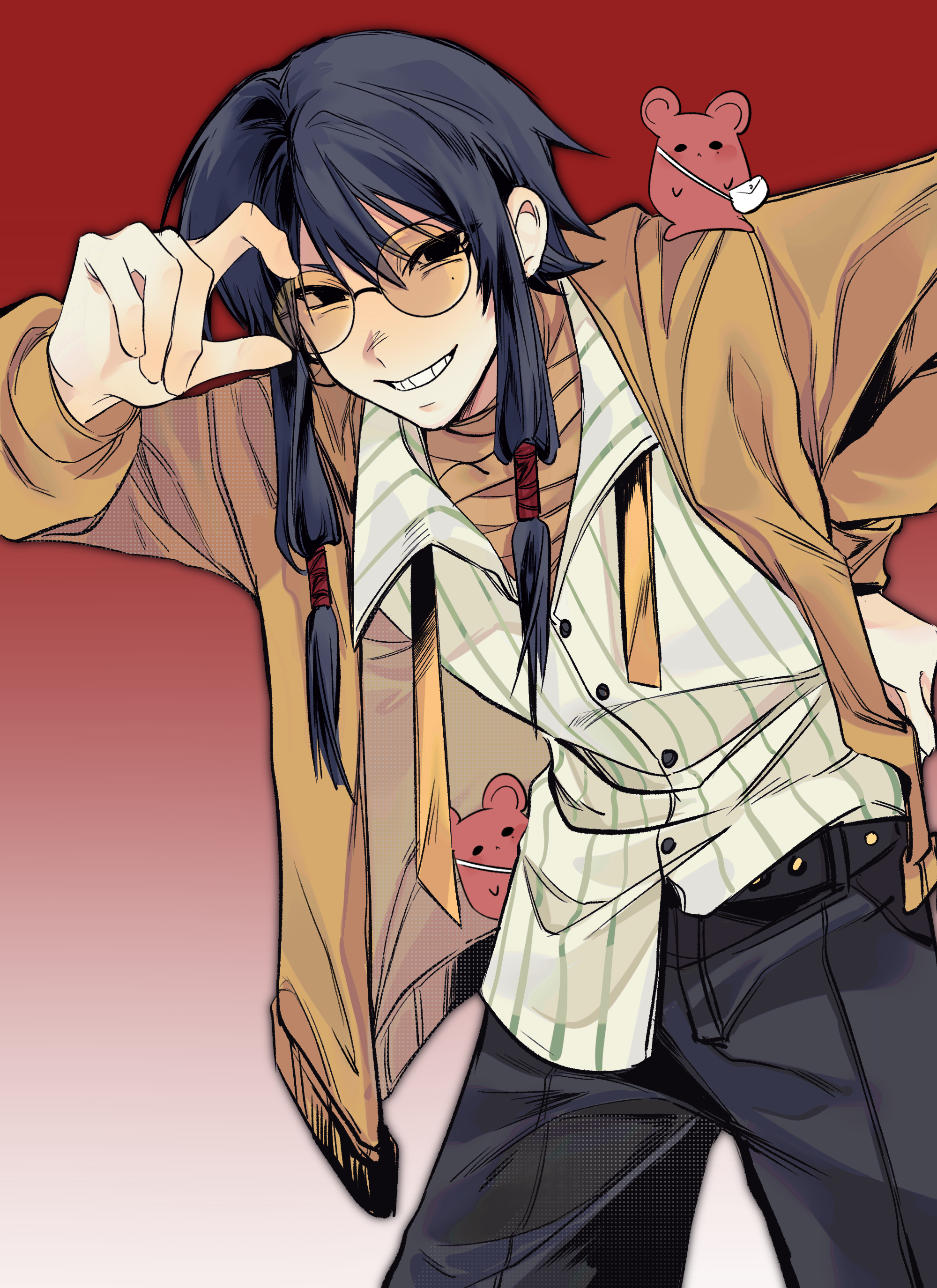 1boy absurdres adjusting_eyewear black_eyes black_hair black_pants chinese_commentary collared_shirt commentary_request cowboy_shot gradient_background grin hand_on_own_hip highres jacket li_yuting_(mouse) long_sleeves male_focus mole mole_under_eye open_clothes open_jacket pants red_background round_eyewear shirt shirt_partially_tucked_in short_hair_with_long_locks smile striped_clothes striped_shirt touqi_guaitan variant_set vertical-striped_clothes vertical-striped_shirt white_shirt yellow_jacket yu06836928 ziche_fuzhao