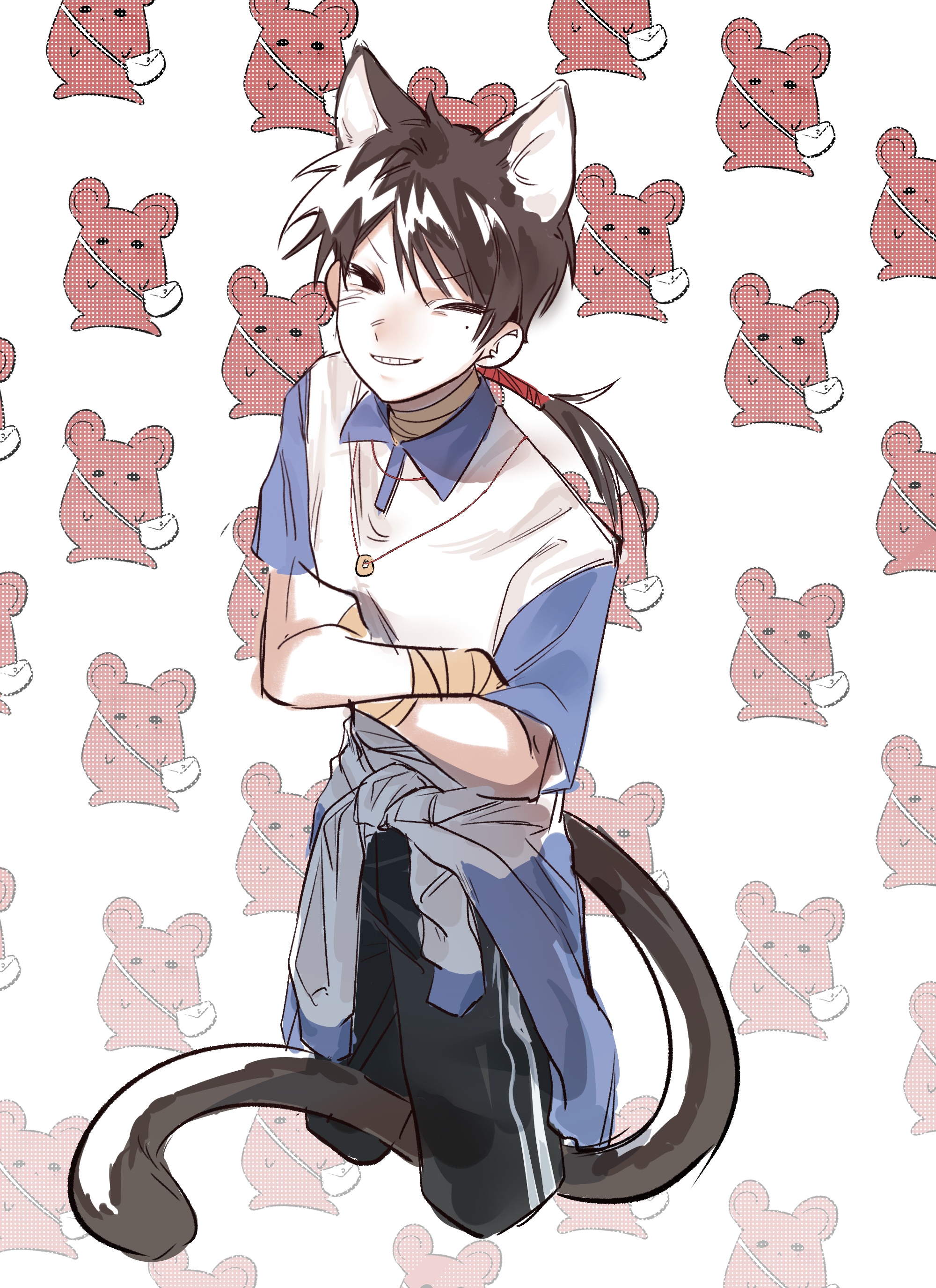 1boy absurdres animal_ears between_legs black_eyes black_hair black_pants blue_jacket blue_sleeves cat_boy cat_ears chinese_commentary clothes_around_waist collared_shirt commentary_request cropped_legs grin highres jacket jacket_around_waist kemonomimi_mode li_yuting_(mouse) male_focus mole mole_under_eye one_eye_closed pants shirt smile tail tail_between_legs touqi_guaitan white_shirt yu06836928 ziche_fuzhao