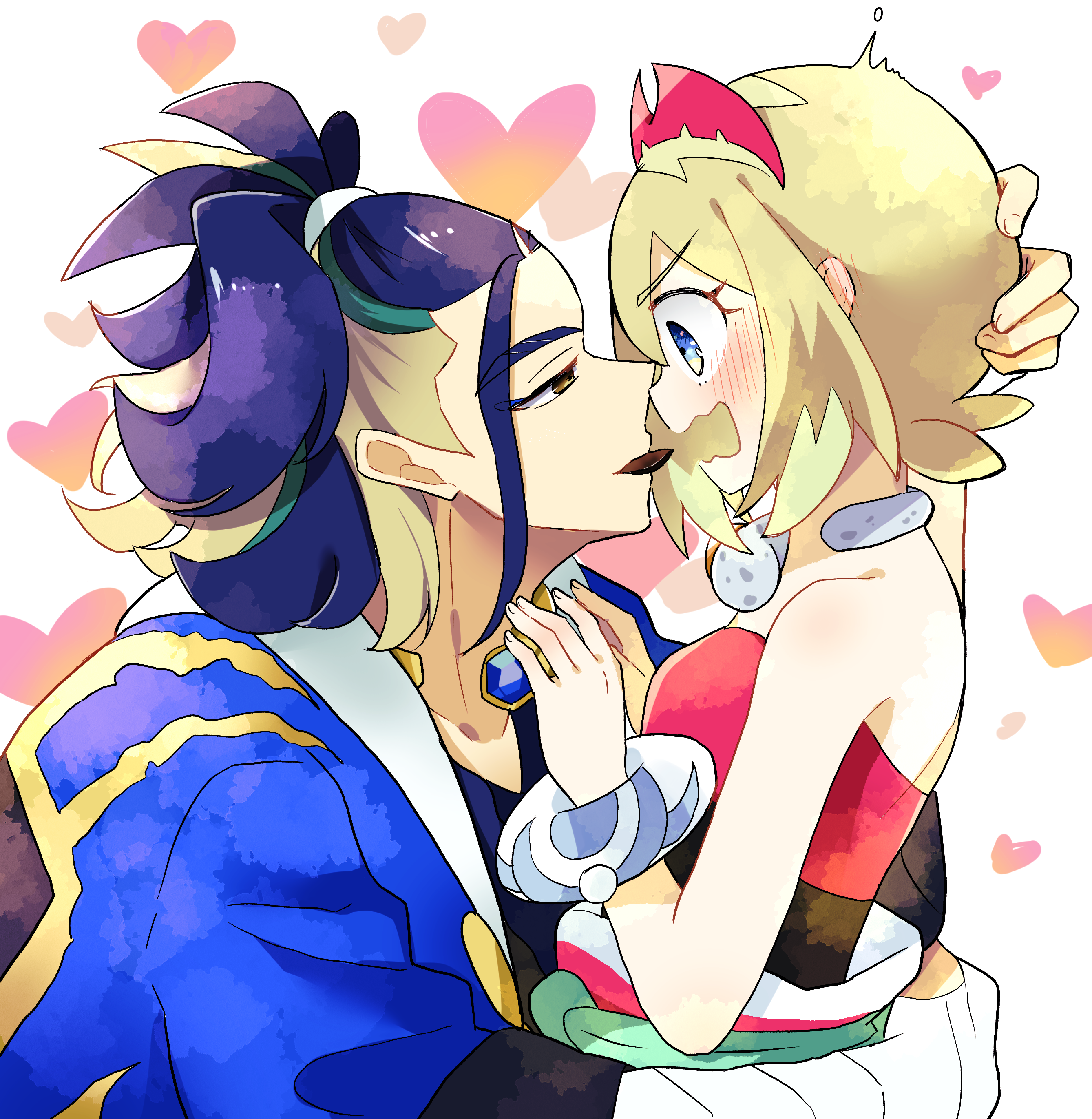 1boy 1girl absurdres adaman_(pokemon) arm_wrap blonde_hair blue_hair blush brown_eyes chocolate ear_blush face-to-face food_in_mouth heart hetero highres hug irida_(pokemon) kazune_(kazukana09) looking_at_another multicolored_hair nintendo open_mouth pokemon pokemon_legends:_arceus shirt strapless strapless_shirt two-tone_hair wavy_mouth