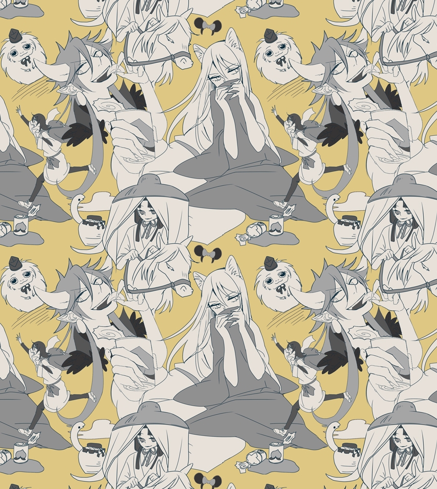 1girl 2boys akura-ou animal animal_ears character_request commentary_request creature eating fangs fox_boy fox_ears greyscale_with_colored_background horns horse horseback_riding japanese_clothes kamisama_hajimemashita kimono long_hair looking_at_viewer mizuki_(kamisama_hajimemashita) multiple_boys nago4 pointy_ears riding running simple_background sitting snake tomoe_(kamisama_hajimemashita) yellow_background