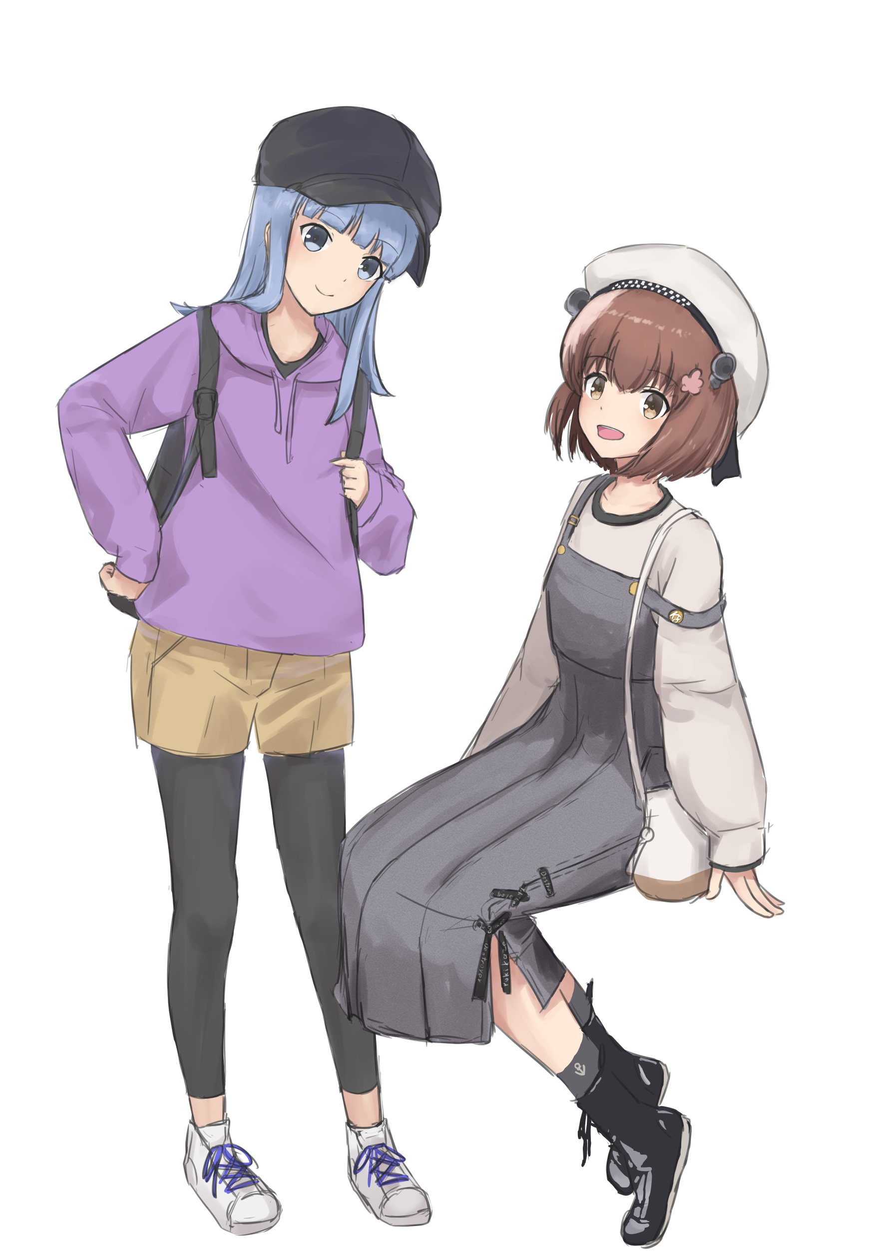 2girls absurdres alternate_costume bag beret black_hat blue_eyes blue_hair blush boots brown_eyes brown_hair brown_shorts dress hat hatsukaze_(kancolle) hatsukaze_(kure)_(kancolle) headgear highres jacket kantai_collection leggings long_dress long_hair long_sleeves looking_at_viewer multiple_girls official_alternate_hairstyle open_mouth purple_jacket shirt shoes short_hair shorts shoulder_bag sitting sleeveless sleeveless_turtleneck smile sneakers solo turtleneck white_shirt yuki_4040 yukikaze_(kancolle) yukikaze_(kure_2024)_(kancolle)