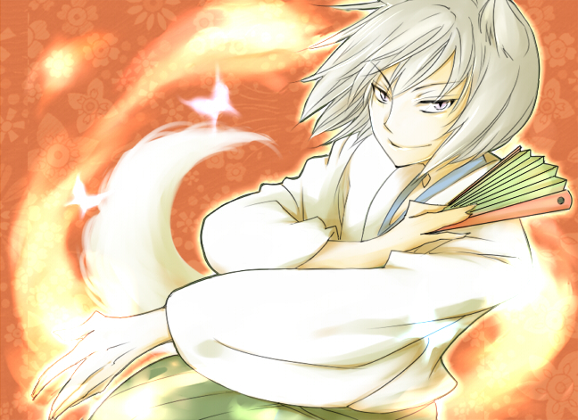 1boy animal_ears blonde_hair commentary_request folding_fan fox_boy fox_ears fox_tail green_hakama hakama hand_fan holding holding_fan japanese_clothes kamisama_hajimemashita kimono looking_at_viewer male_focus orange_background pink_eyes runrun_(sourin) short_hair slit_pupils solo tail tomoe_(kamisama_hajimemashita) upper_body white_kimono