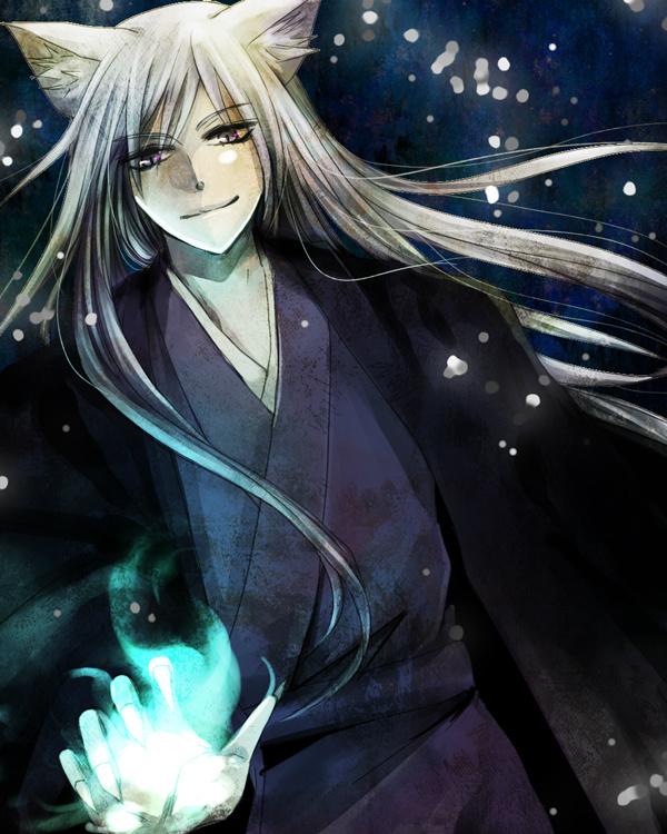 1boy animal_ear_fluff animal_ears blue_background blue_fire commentary_request fingernails fire fox_boy fox_ears grey_eyes grey_hair haori hiyokokko japanese_clothes kamisama_hajimemashita kimono long_hair looking_at_viewer male_focus night outdoors purple_kimono pyrokinesis sharp_fingernails smile snow tomoe_(kamisama_hajimemashita) upper_body
