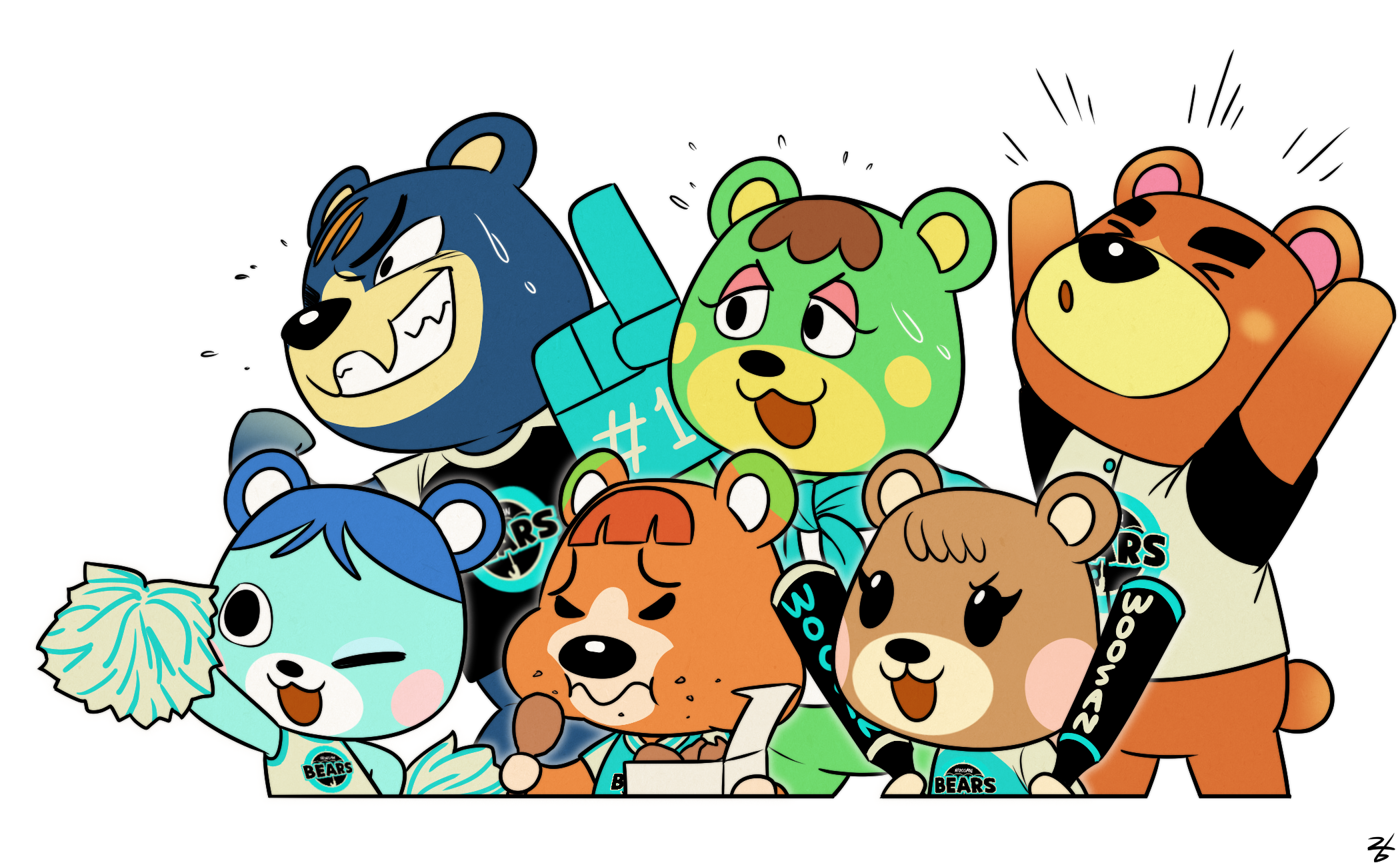 3boys 3girls animal_crossing animal_ears bear_boy bear_ears bear_girl bluebear_(animal_crossing) charlise_(animal_crossing) cheering cheerleader commentary_request eating furry furry_female furry_male groucho_(animal_crossing) highres holding korean_commentary maple_(animal_crossing) multiple_boys multiple_girls nintendo one_eye_closed pom_pom_(cheerleading) pudge_(animal_crossing) rang_(duriri) simple_background teddy_(animal_crossing) white_background