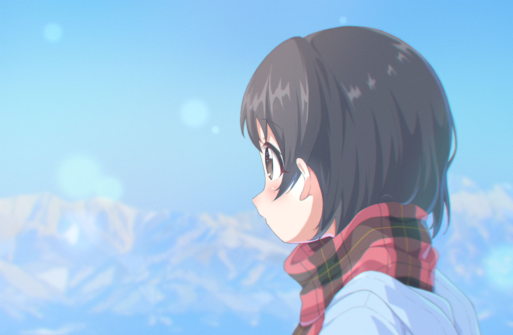 1girl black_eyes black_hair blue_coat blue_sky blurry blurry_background blush coat commentary from_side highres idolmaster idolmaster_cinderella_girls lens_flare looking_ahead mountain outdoors plaid_clothes plaid_scarf red_scarf sasaki_chie scarf short_hair sky snow solo toma_(shinozaki) winter winter_clothes