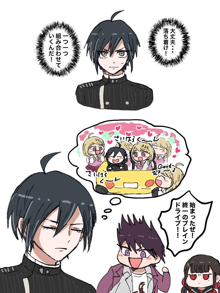 1girl 2boys :d ahoge akamatsu_kaede black_sailor_collar cat danganronpa_(series) danganronpa_v3:_killing_harmony facial_hair goatee hair_ornament hair_scrunchie happy harukawa_maki heart hetero highres imagining jacket kiri_(kr_hpmi) long_hair mole mole_under_eye momota_kaito multiple_boys multiple_persona open_mouth pink_jacket red_eyes red_scrunchie saihara_shuichi sailor_collar scrunchie short_hair smile speech_bubble spiked_hair striped_clothes striped_jacket thought_bubble translation_request