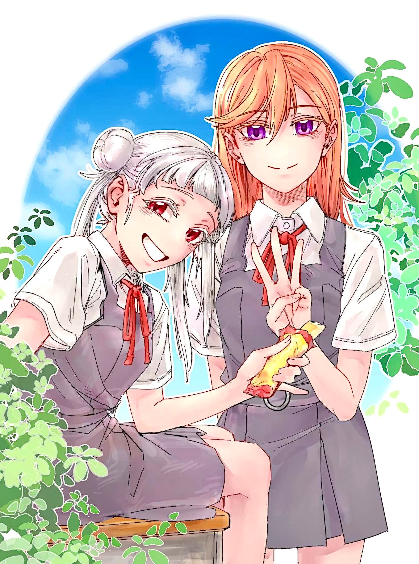 2girls arashi_chisato arched_bangs blue_sky border closed_mouth cloud collared_shirt commentary cowboy_shot double_bun dress dress_shirt feet_out_of_frame food fukurou_tojo grey_dress grin hair_between_eyes hair_bun highres holding holding_food leaf long_hair looking_at_viewer love_live! love_live!_superstar!! medium_dress middle_w multiple_girls neck_ribbon orange_hair outside_border oval_border pinafore_dress purple_eyes red_eyes red_ribbon ribbon round_border school_uniform shibuya_kanon shirt short_sleeves sky sleeveless sleeveless_dress smile split_mouth summer_uniform swept_bangs textless_version twintails w white_border white_hair white_shirt yuigaoka_school_uniform