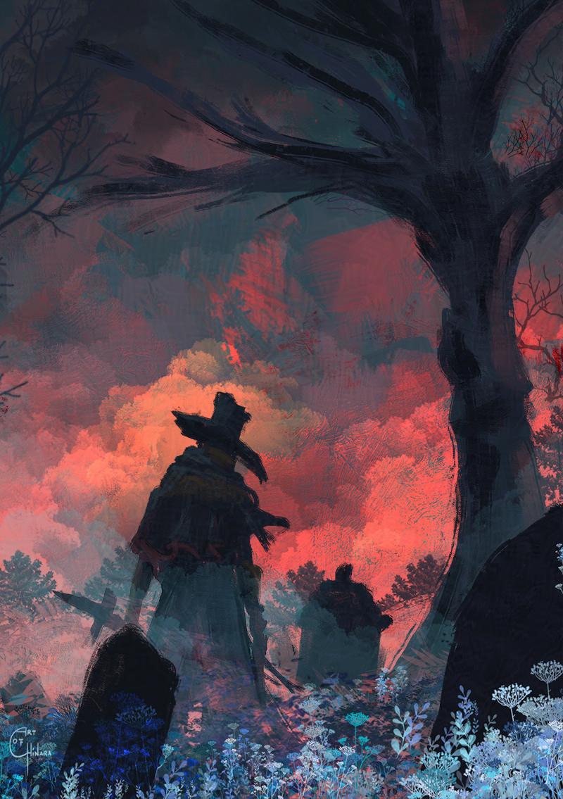 1boy artofchinara bare_tree black_capelet black_coat black_hat bloodborne blue_flower capelet coat commentary english_commentary field flower flower_field hat male_focus old_hunter_(bloodborne) red_sky sky solo tombstone top_hat tree