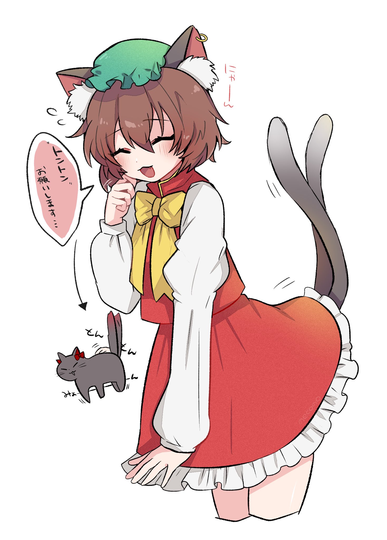 1girl :d ^_^ animal_ear_fluff animal_ear_piercing animal_ears arm_at_side blush bow bowtie brown_hair cat_ears cat_tail chen closed_eyes cowboy_shot cropped_legs double-parted_bangs earrings fang flying_sweatdrops frills hair_between_eyes hand_up hat highres jewelry juliet_sleeves kaenbyou_rin kaenbyou_rin_(cat) leaning_forward long_sleeves mob_cap multiple_tails necono_(nyu6poko) nekomata open_mouth petticoat puffy_sleeves red_skirt red_vest short_hair simple_background single_earring skirt skirt_set smile solo speech_bubble tail touhou translation_request two_tails vest white_background yellow_bow yellow_bowtie