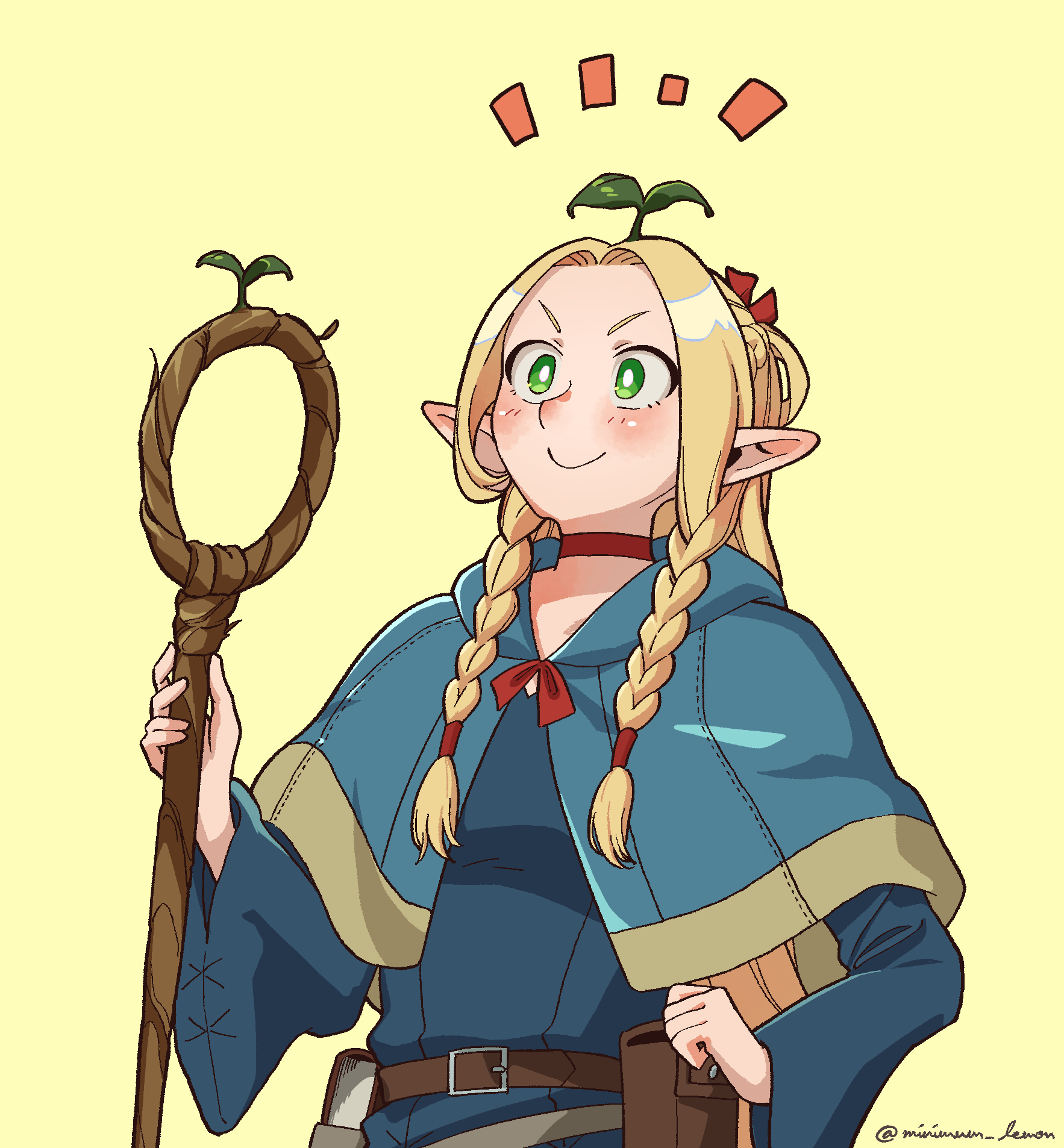 1girl ambrosia_(dungeon_meshi) artist_name belt blonde_hair blue_robe blush book braid capelet choker dungeon_meshi elf green_eyes hair_ribbon highres holding holding_staff long_hair long_sleeves marcille_donato minimum_lemon plant_on_head pointy_ears pouch red_choker red_ribbon ribbon robe smile solo staff yellow_background