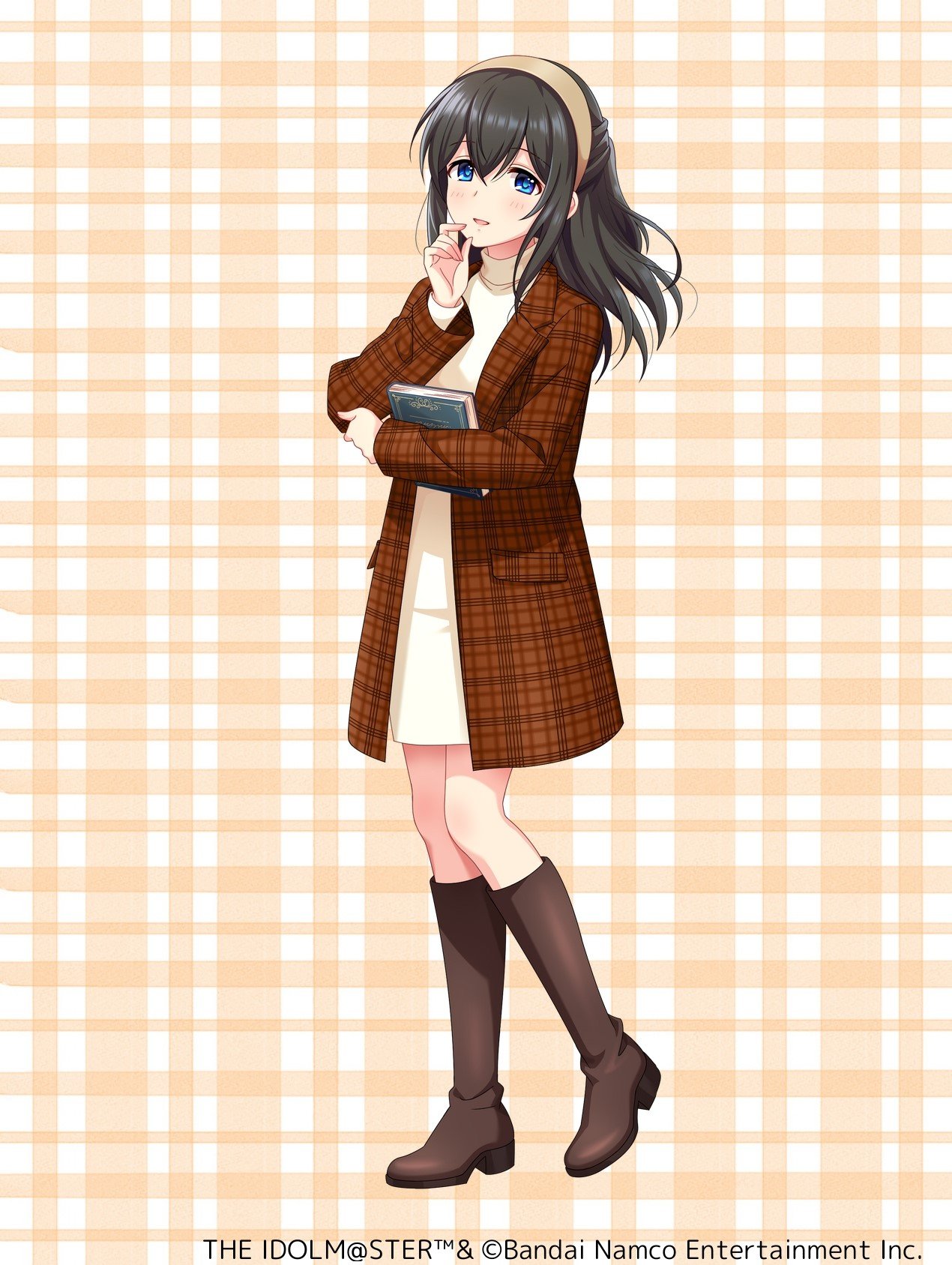 1girl black_hair blue_eyes book boots brown_coat coat commentary_request dress full_body hairband highres holding holding_book idolmaster idolmaster_cinderella_girls long_hair official_art open_clothes open_coat sagisawa_fumika solo white_dress