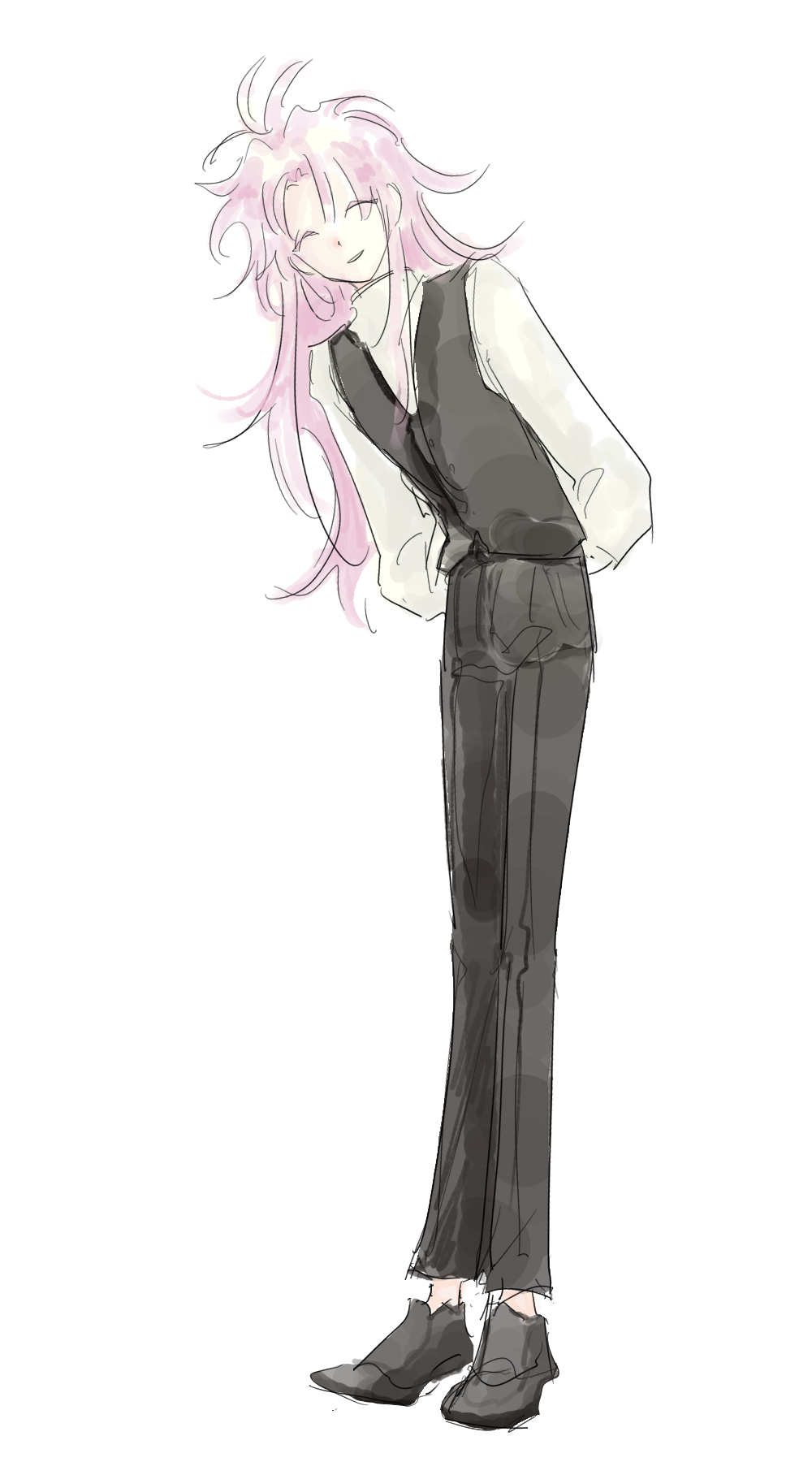 1boy arms_behind_back black_pants black_shoes black_vest closed_eyes commentary_request facing_viewer full_body hatsutori_hajime henohenomoheji_(tpvtlsrp) highres korean_commentary leaning_to_the_side long_hair long_sleeves male_focus pants parted_lips pink_hair saibou_shinkyoku shirt shoes simple_background sketch smile solo vest white_background white_shirt