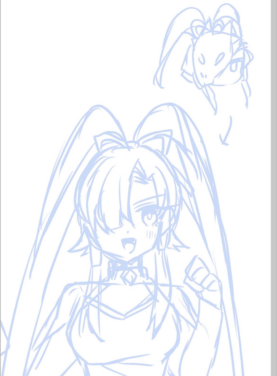 1girl breasts chibi face_reveal female_focus happy helmet highres large_breasts nacht_7810 open_mouth reveal rough_sketch sketch smile solo swordsoul_(yu-gi-oh!) swordsoul_of_mo_ye twintails unworn_headwear unworn_helmet yu-gi-oh!