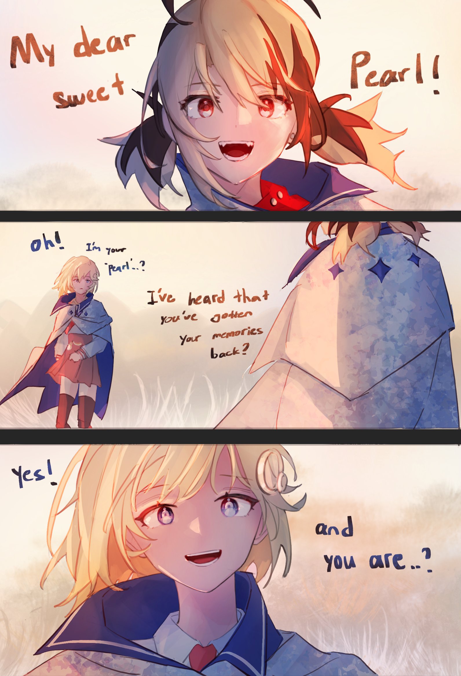 ! 2girls ? ahoge blonde_hair blue_eyes brown_hair cape talking english_text enigmatic_recollection fangs gigi_murin grass highres hololive hololive_english multicolored_hair multiple_girls open_mouth red_eyes skirt smile sunset teeth two-tone_hair virtual_youtuber watson_amelia weiiyxn