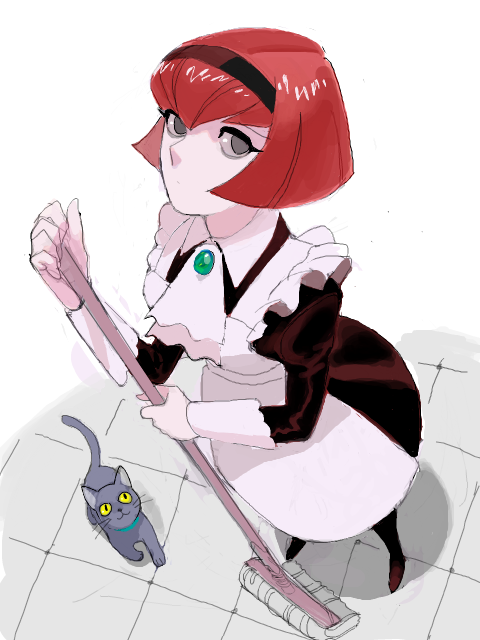 1girl apron ascot black_dress black_eyes black_hairband black_pantyhose cat dress from_above gakudou_(rom3boom) grey_cat hairband holding holding_mop juliet_sleeves long_sleeves looking_at_viewer mop pantyhose puffy_sleeves r_dorothy_wayneright red_hair short_hair solo the_big_o white_apron white_ascot