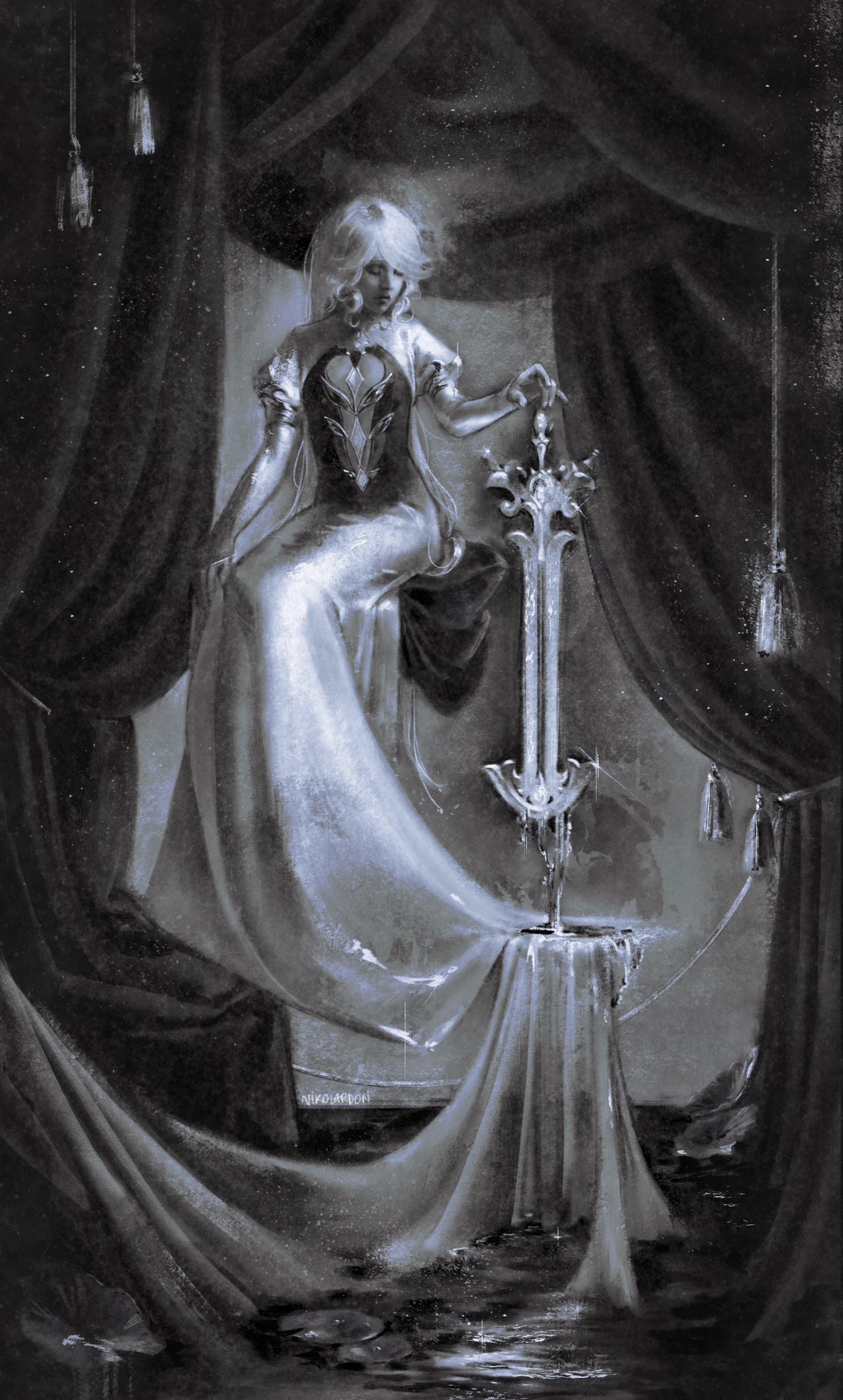 1girl closed_eyes closed_mouth curtains dress floating floating_object focalors_(genshin_impact) full_body furina_(genshin_impact) genshin_impact greyscale highres lips long_hair long_sleeves monochrome nikolas_(nikolardon) sitting solo stage_curtains sword very_long_hair water weapon
