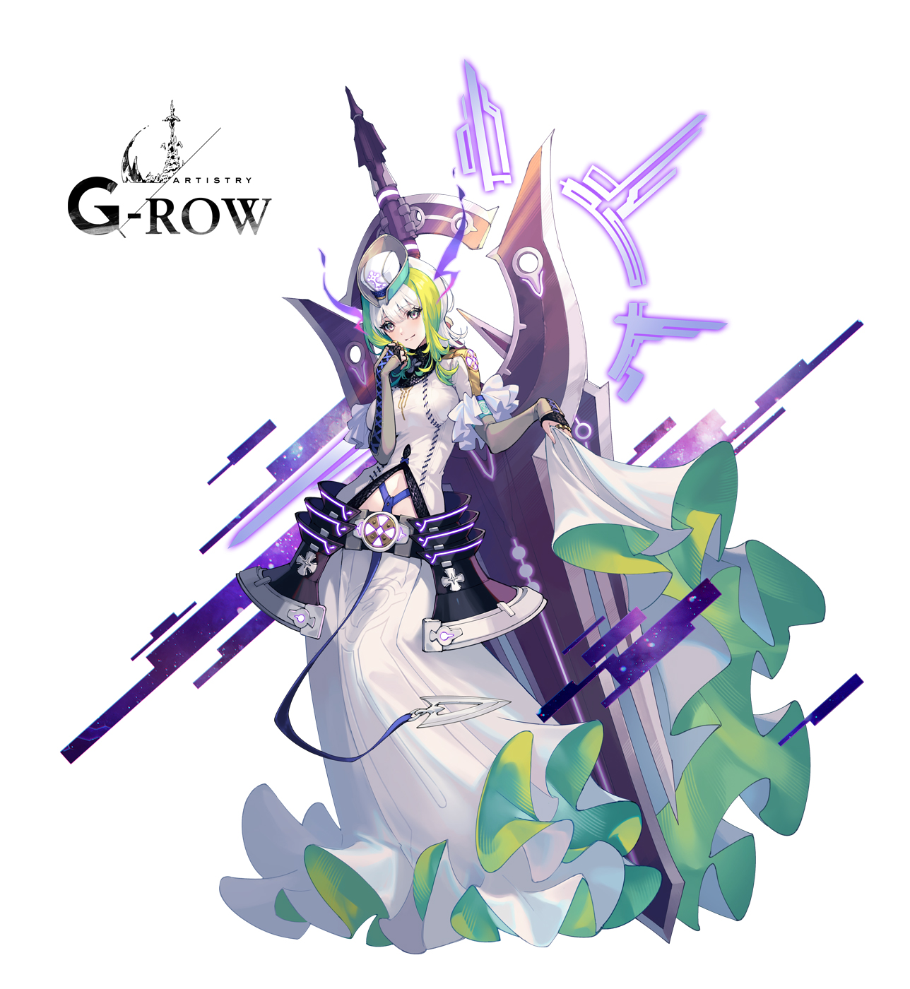 1girl closed_mouth commentary_request dress green_hair grey_eyes hand_on_own_cheek hand_on_own_face hat highres long_skirt looking_at_viewer masia_(ta_ga_tame_no_alchemist) medium_hair midriff official_art second-party_source shiro_(castle.gumi) simple_background skirt smile ta_ga_tame_no_alchemist white_background white_dress white_hat white_skirt