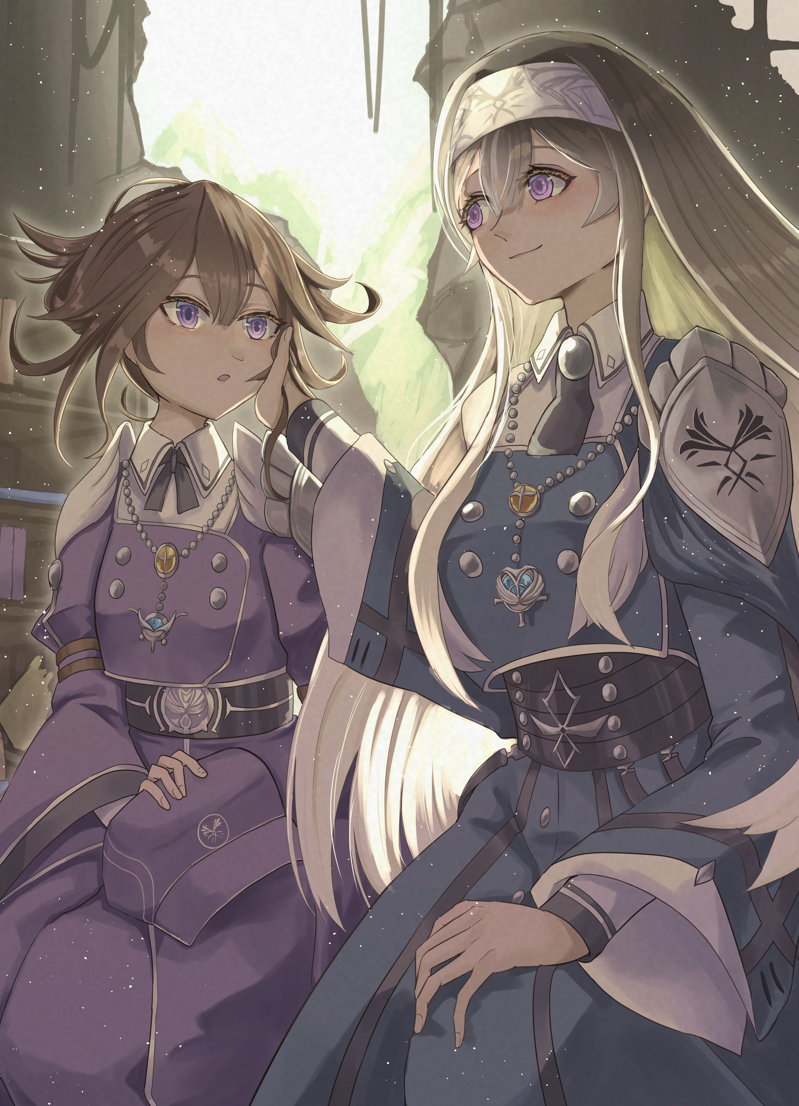 2girls absurdres blonde_hair breasts brown_hair dress duel_monster exosister_irene exosister_sophia grey_hair hair_ornament hairband hand_on_another's_cheek hand_on_another's_face hat highres kokorokorokoro417 large_breasts long_hair long_sleeves multiple_girls open_mouth pants purple_eyes short_hair smile very_long_hair yu-gi-oh!