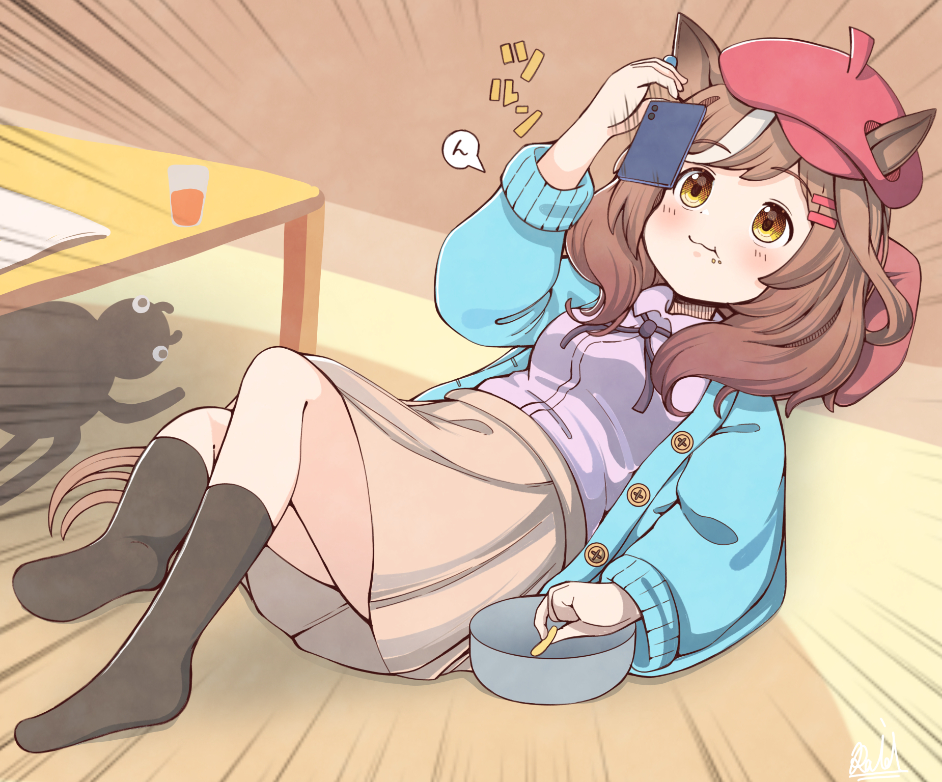 1girl animal_ears blush bowl breasts casual cellphone commentary_request eating full_body hair_ornament hairclip hat highres holding holding_phone horse_ears horse_girl impending_doom jacket lying matikanetannhauser_(casual)_(umamusume) matikanetannhauser_(umamusume) medium_breasts medium_hair phone rakugakiraid signature simple_background socks solo stuffed_toy table umamusume
