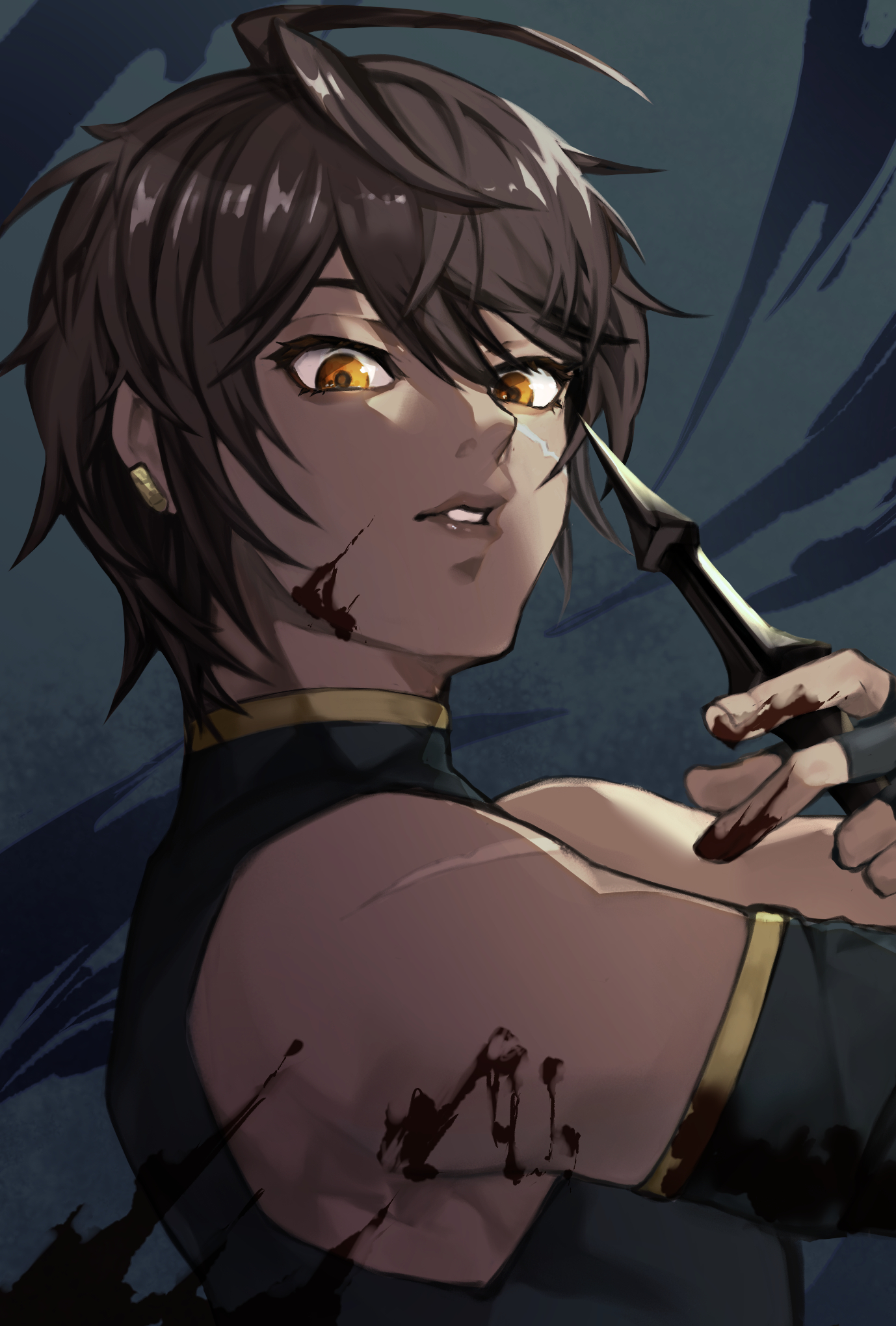 1boy black_gloves black_hair blood blood_on_face dark-skinned_male dark_skin elbow_gloves fingerless_gloves gloves granblue_fantasy hair_between_eyes highres jamil_(granblue_fantasy) kei9969 looking_at_viewer male_focus scar scar_on_face scar_on_shoulder short_hair solo white_scars yellow_eyes