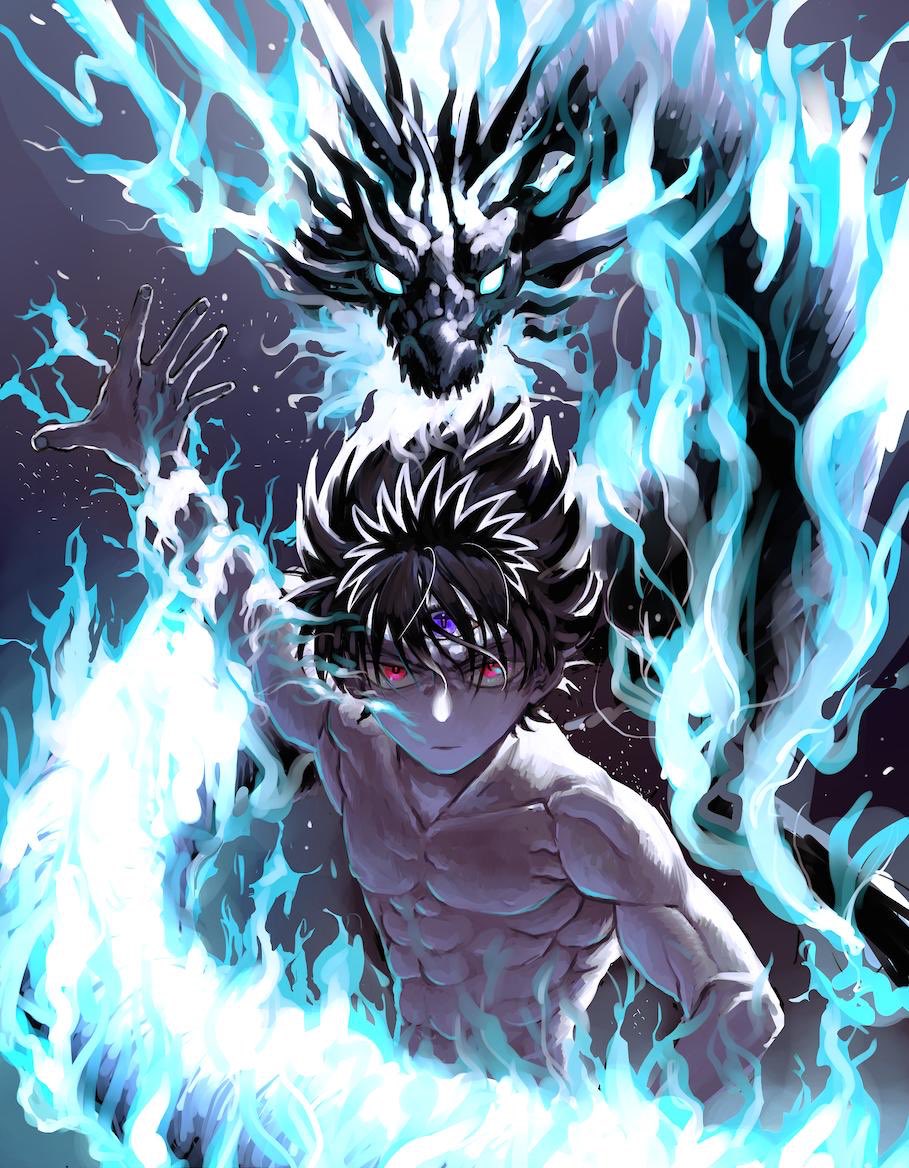 1boy abs black_hair blue_fire dragon eastern_dragon fire hashtag-only_commentary hiei_(yu_yu_hakusho) incoming_attack looking_at_viewer male_focus mame_moyashi muscular muscular_male pectorals purple_eyes red_eyes third_eye topless_male yuu_yuu_hakusho