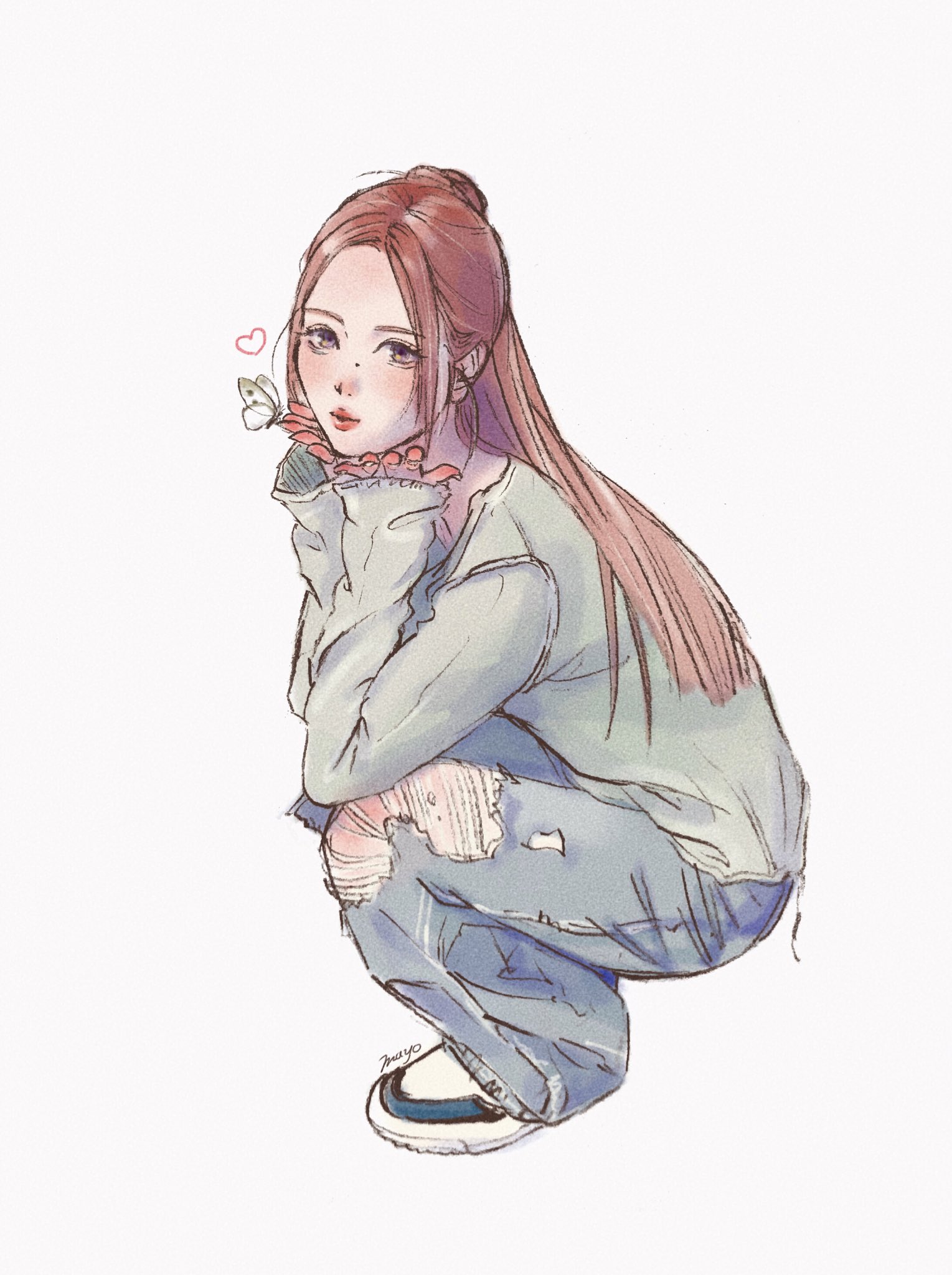 1girl animification blue_pants blue_shirt blush brown_eyes brown_hair bug butterfly denim hands_on_own_cheeks hands_on_own_face heart highres insect jeans katsumura_maya long_hair looking_at_viewer mayo11127925 mole mole_on_nose niziu pants real_life shirt solo squatting torn_clothes torn_pants white_footwear