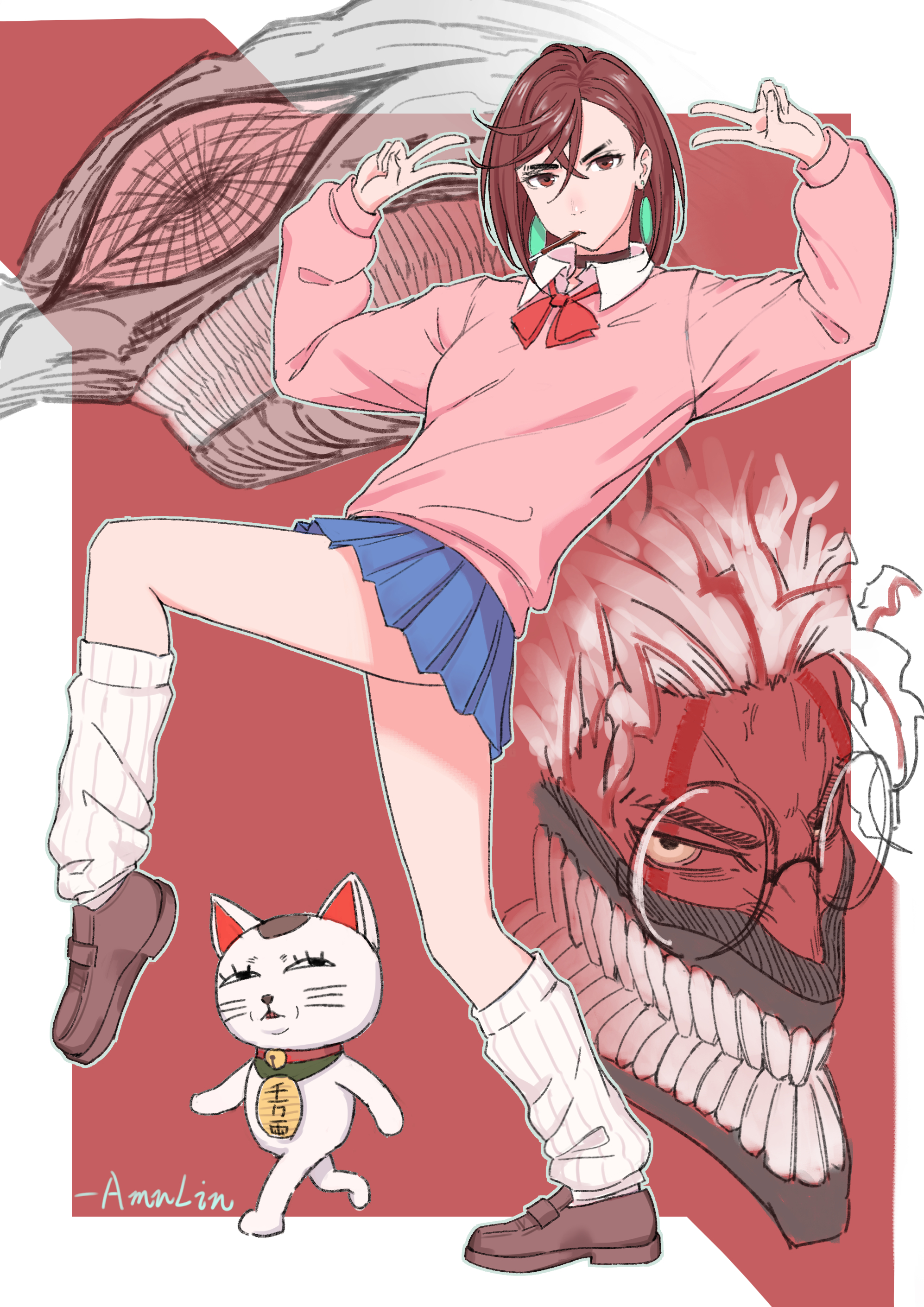 1boy 1girl absurdres alternate_form ayase_momo black_choker blue_skirt border bow bowtie brown_eyes brown_footwear brown_hair cat choker closed_mouth collared_shirt commentary dandadan double_v earrings facial_mark food food_in_mouth foot_up full_body glasses hair_between_eyes hands_up highres jewelry kneehighs long_sleeves looking_at_viewer loose_bowtie loose_socks mask miniskirt mouth_mask outside_border pink_sweater pleated_skirt pocky pocky_in_mouth quietmrcat red_bow red_bowtie round_eyewear school_uniform serious shirt short_hair skirt socks standing standing_on_one_leg sweater takakura_ken_(dandadan) takakura_ken_(transformed)_(dandadan) thick_eyebrows turbo_granny_(dandadan) upper_body v white_border white_hair white_shirt white_socks