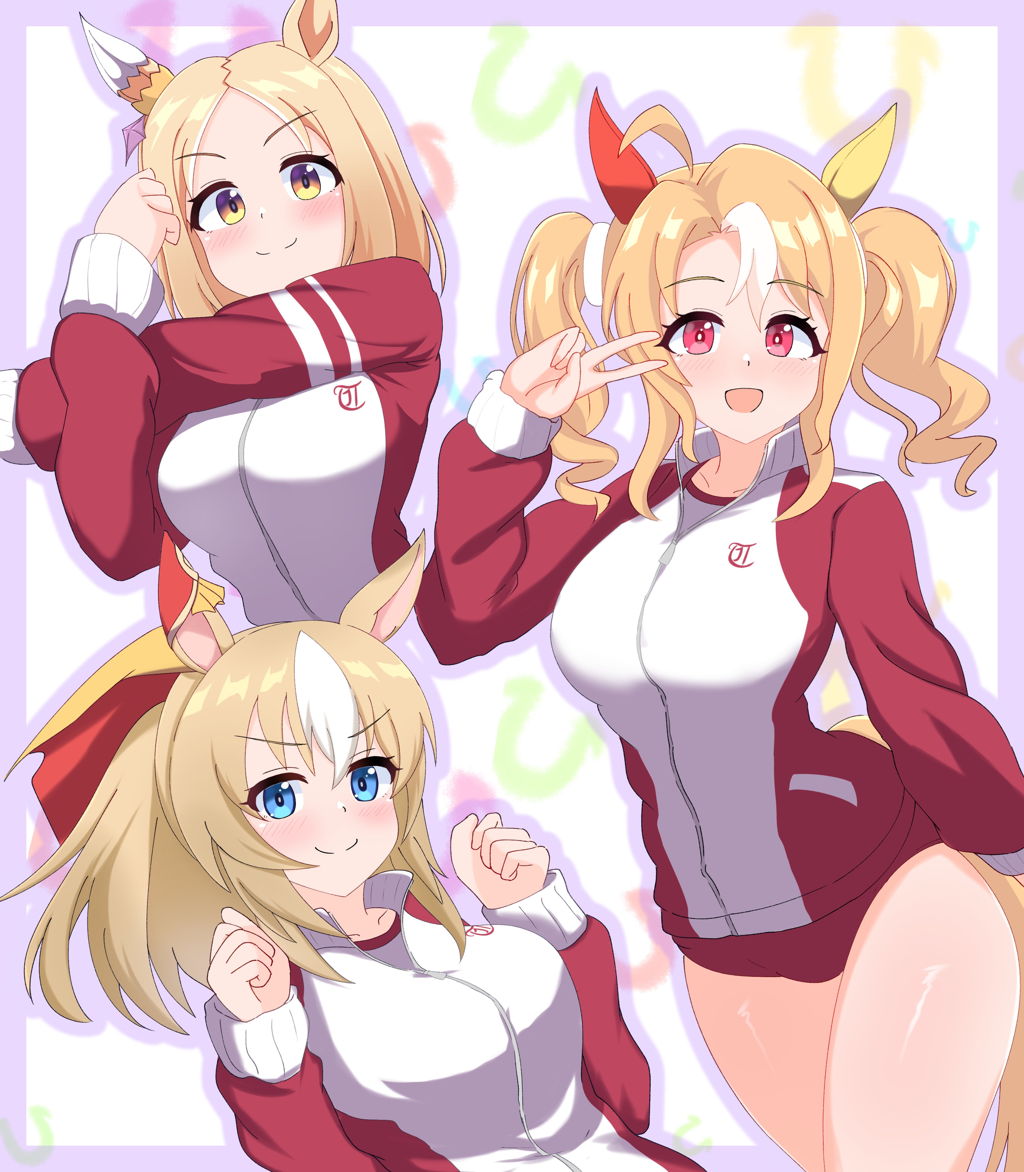 3girls absurdres animal_ears blue_eyes blush breasts buruma clenched_hands durandal_(umamusume) fusaichi_pandora_(umamusume) hair_between_eyes highres horse_ears horse_girl horse_tail jacket large_breasts looking_at_viewer medium_hair multiple_girls narita_top_road_(umamusume) okomesuihanki open_mouth red_eyes short_twintails simple_background smile tail thick_thighs thighs track_jacket twintails umamusume v yellow_eyes