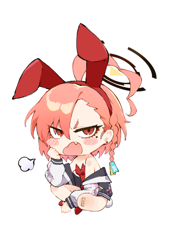 1girl ahoge animal_ears blue_archive blush_stickers braid chibi ear_piercing fang halo mole mole_under_eye neru_(blue_archive) neru_(bunny)_(blue_archive) orange_hair piercing playboy_bunny rabbit_ears rabbit_tail red_eyes short_hair simple_background single_braid suruga_kreuz tail white_background
