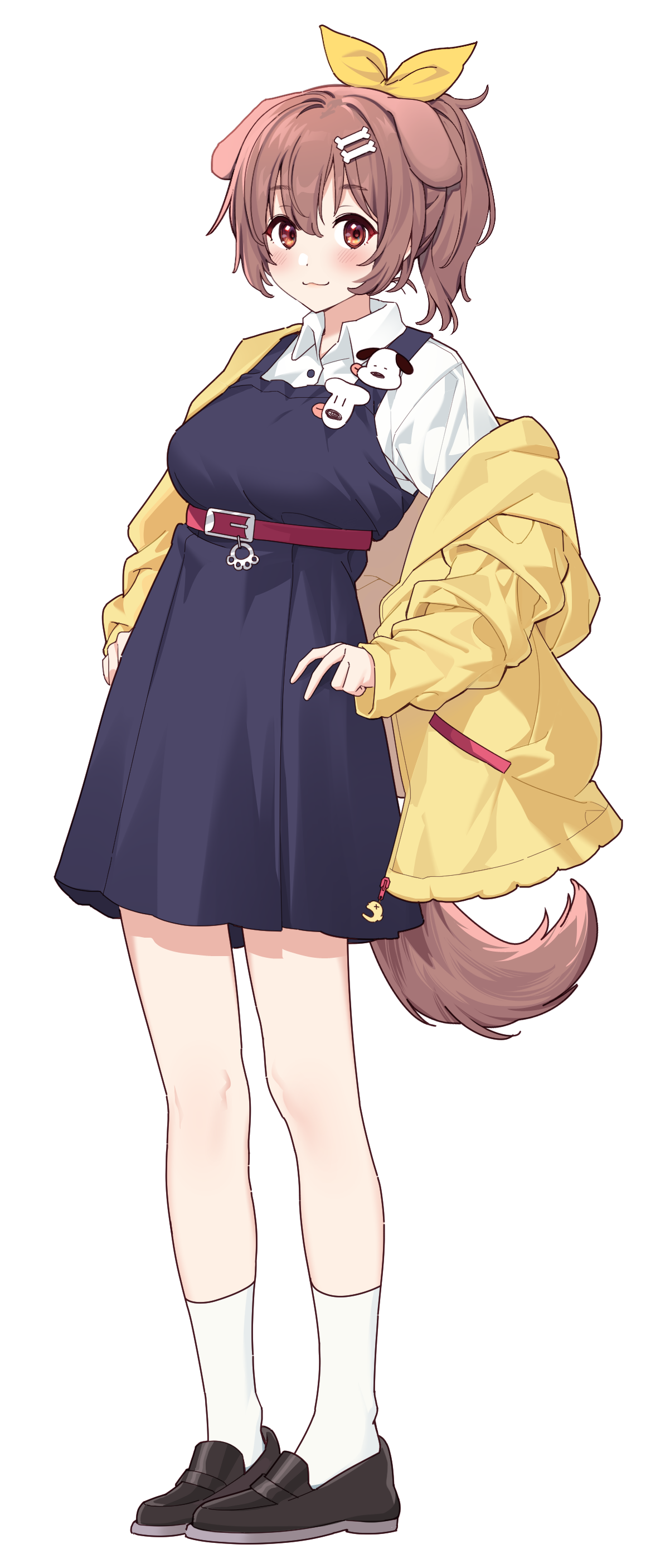 14_(vision5032) 1girl :3 absurdres adapted_costume alternate_costume animal_ears belt black_shoes blue_dress bone_hair_ornament bow breasts brown_eyes brown_hair cartoon_bone closed_mouth collared_shirt commentary_request dog_ears dog_girl dog_tail dress extra_ears full_body futo-inu hair_between_eyes hair_bow hair_ornament hairclip highres hololive hoso-inu inugami_korone inugami_korone_(1st_costume) jacket large_breasts light_blush listener_(inugami_korone) loafers long_sleeves looking_at_viewer medium_hair official_alternate_hairstyle open_clothes open_jacket pinafore_dress ponytail red_belt shirt shoes simple_background sleeveless sleeveless_dress socks solo tail virtual_youtuber white_background white_shirt white_socks yellow_bow yellow_jacket