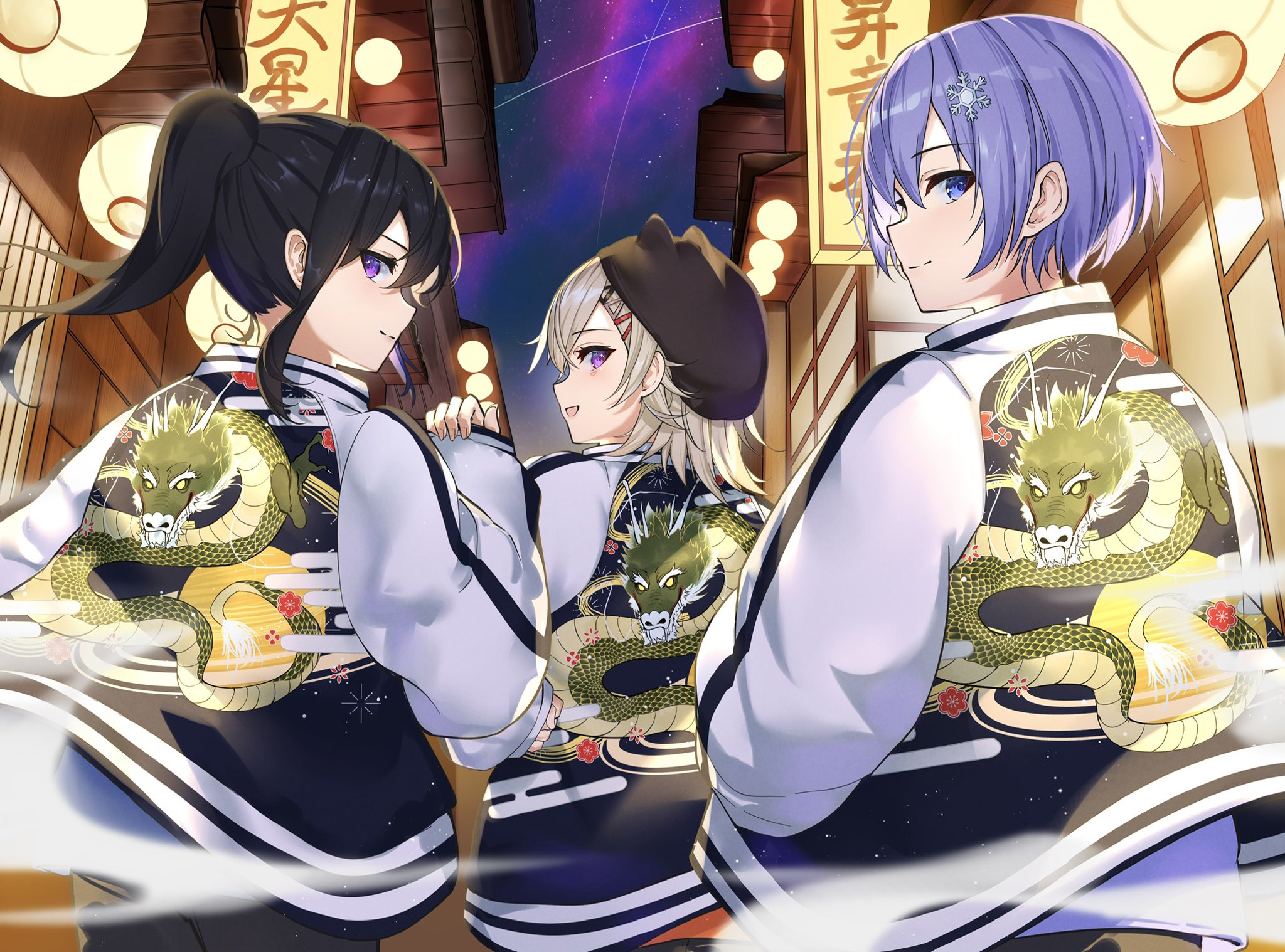 1boy 2girls architecture black_hair black_hat black_jacket blue_eyes blue_hair dragon_print east_asian_architecture from_behind grey_hair hair_ornament hairclip hat highres ichinose_uruha jacket komori_met lantern letterman_jacket long_hair long_sleeves multiple_girls neo-porte night paper_lantern ponytail purple_eyes ringozeri shirayuki_reid short_hair smile smoke snowflake_hair_ornament virtual_youtuber vspo! white_jacket
