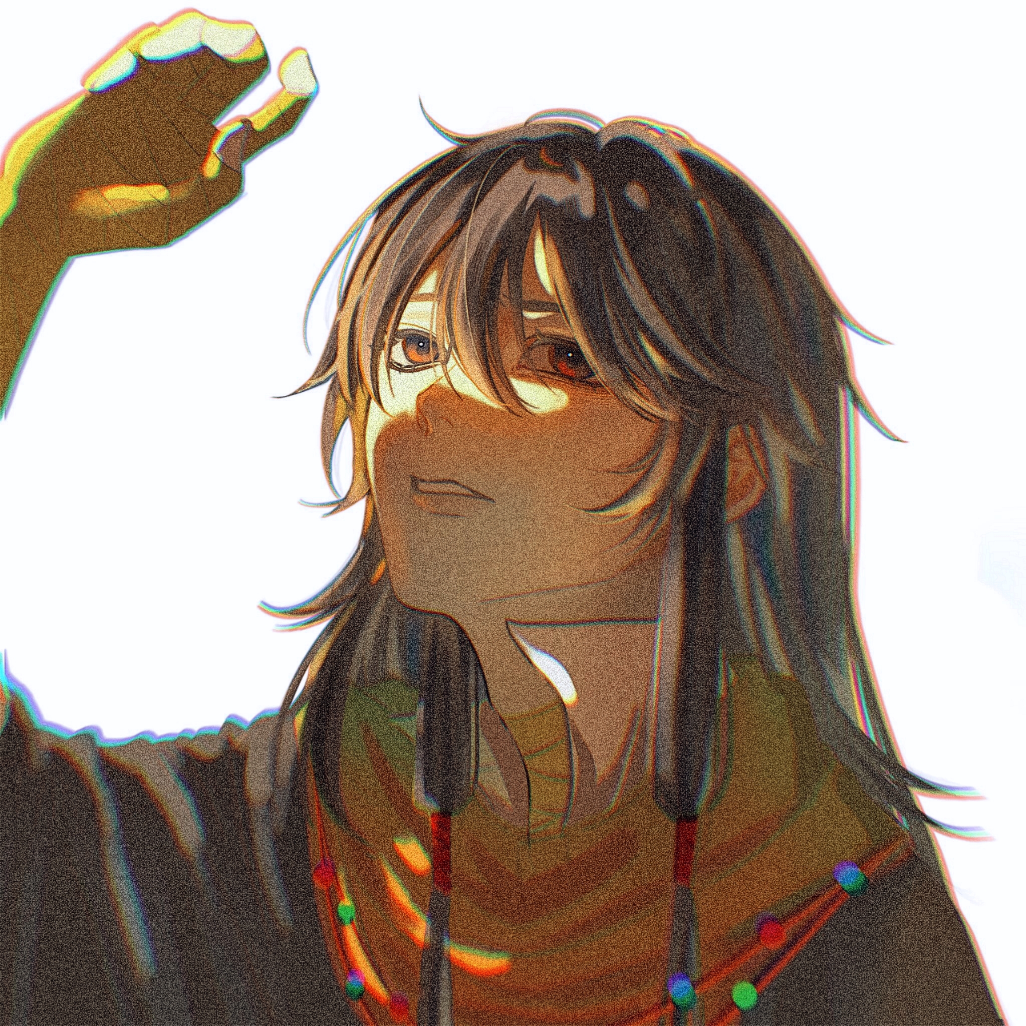 1boy alternate_eye_color arm_up bandaged_hand bandaged_neck bandages beads black_jacket chinese_commentary chromatic_aberration commentary_request film_grain hair_between_eyes highres jacket long_hair male_focus nairuohe438 popped_collar portrait red_eyes scarf shirt sidelocks simple_background solo touqi_guaitan variant_set white_background white_shirt yellow_scarf ziche_fuzhao